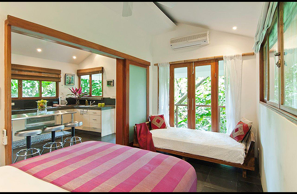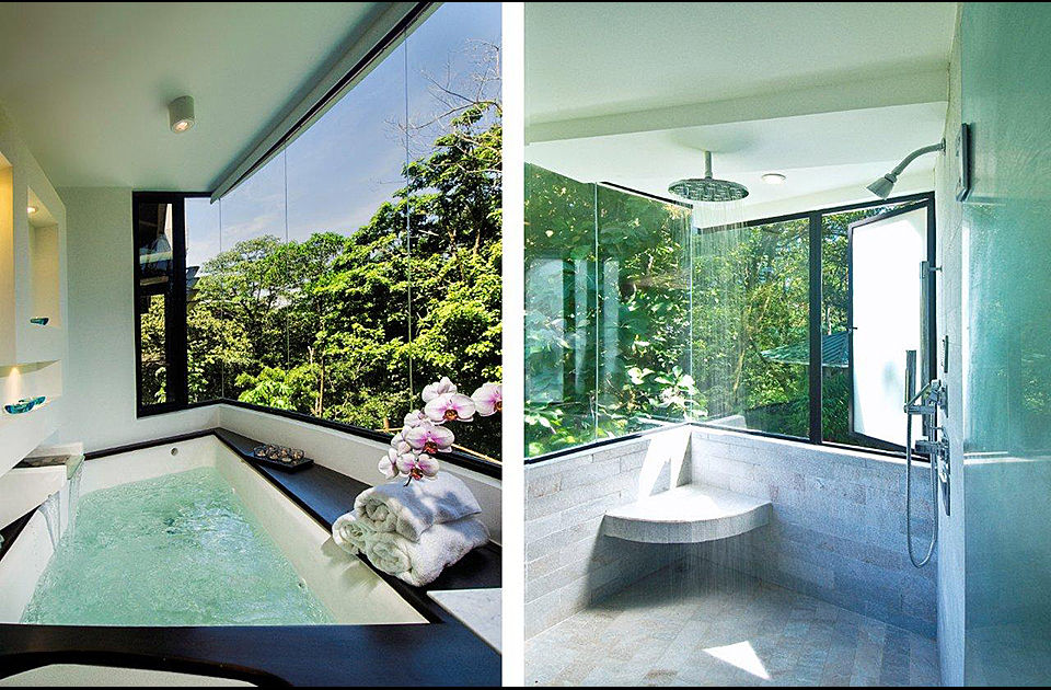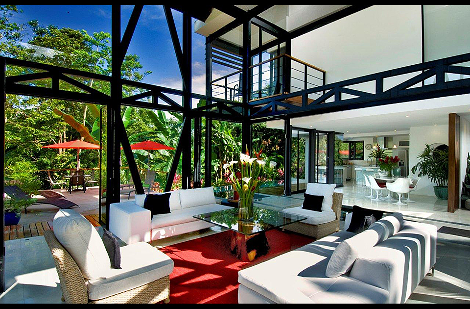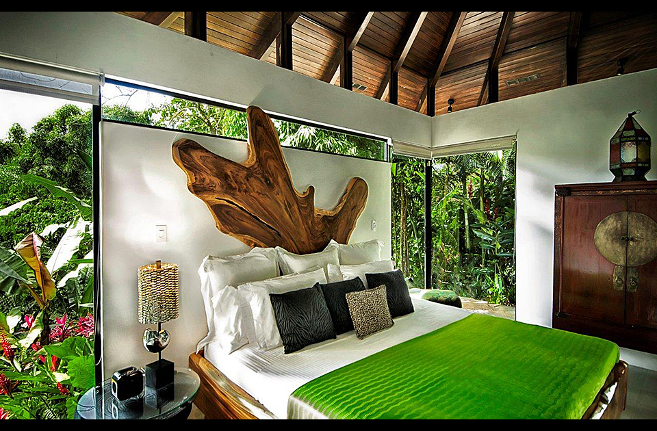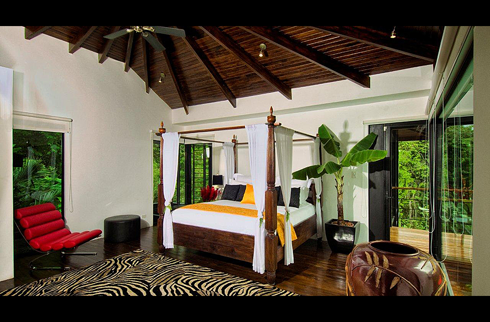 The bottom level consists of the living room,with 42" plasma TV, dining area, gourmet kitchen and indoor/outdoor bar area. The four large bedrooms overlook the jungle and pool and two uniquely designed interior gardens. There are three bedrooms on the second level all with queen or king beds, ceiling fans, A/C, opulent bathrooms and built in closets. The exquisite master suite, which encompasses the entire top floor, was designed with exotic wood floors, and a bathroom that has a Jacuzzi tub and a separate outdoor shower.