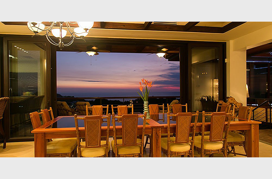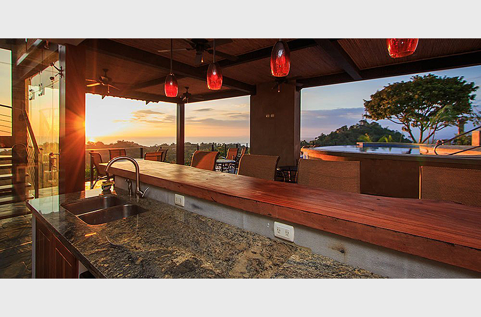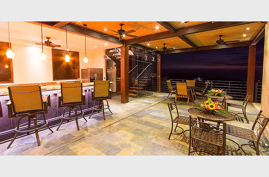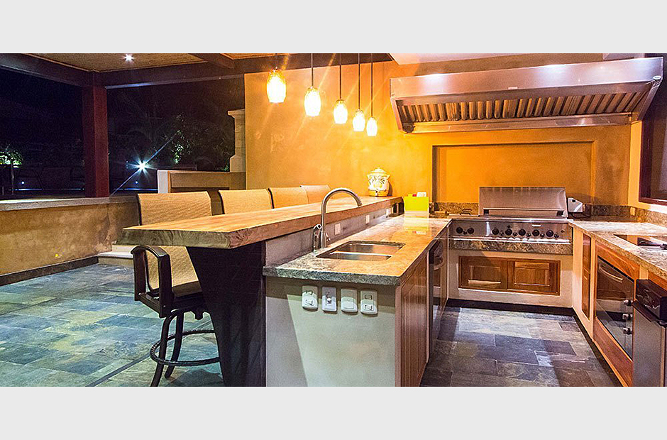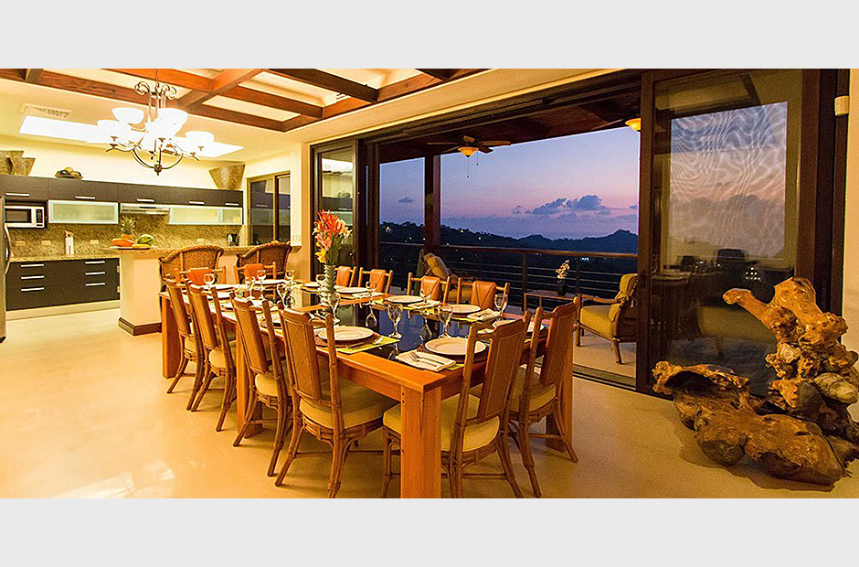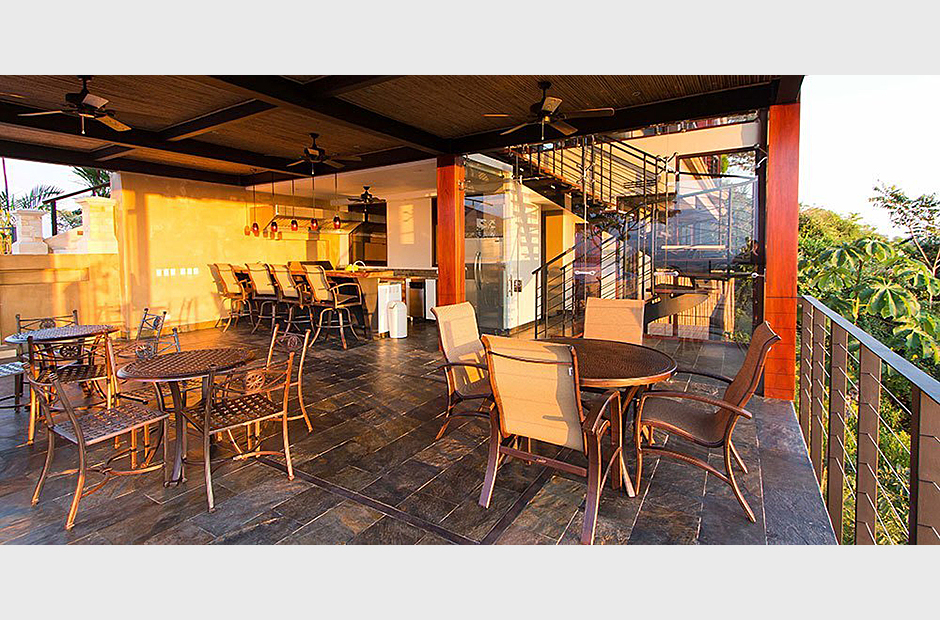 There are floor to ceiling sliding glass doors that can be completely opened to let the fresh Ocean breezes in during the day or closed to enjoy the cool air-conditioning which is throughout the living space and all bedrooms along with uniquely designed and very functional ceiling fans. Every bedroom has its own terrace to see the best sunsets in the world and the mountainous backdrop of this amazingly beautiful region. A large kitchen in the center of the house serves as the perfect indoor gathering space and is equipped with granite counter-tops cabinetry from Italy and top of the line stainless steel appliances. Adjacent to the kitchen is a spacious living area and is the perfect space for rest, relaxation or watching your favorite program on the large plasma TV. There are also flat screen TVs on all three floors