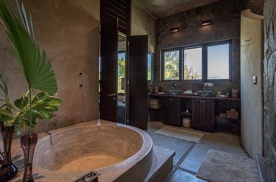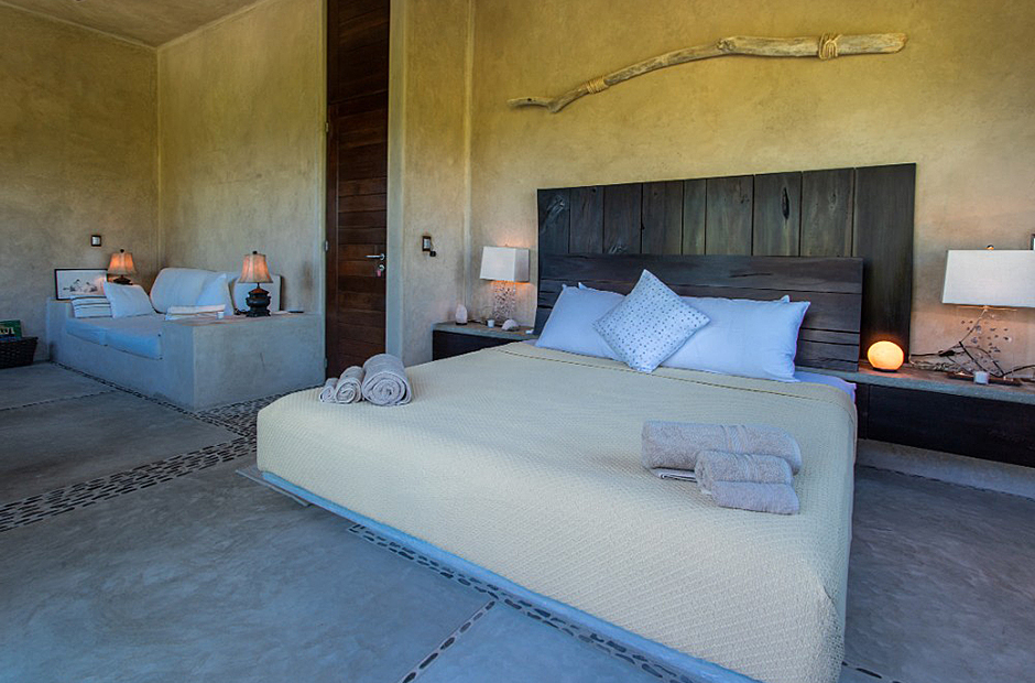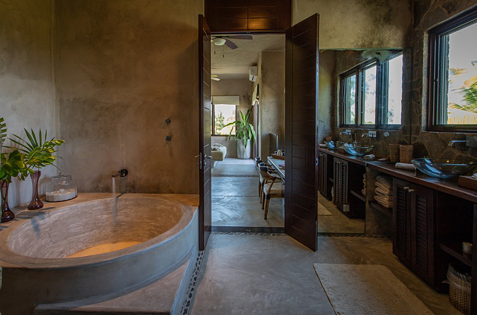 The downstairs has a large open floor plan with a living area which includes two queen sleeper sofas, TV area with a wide screen TV ideal for gathering, a grand dining room which seats 18 – 20. The kitchen has all top appliances including a Viking stove, double ovens, Sub Zero refrigerator/freezer, dishwasher, etc. A long zapote wooden bar between the kitchen and dining room provides a serving area as well as additional seating. There is one bedroom downstairs with a double bed and full private bathroom.