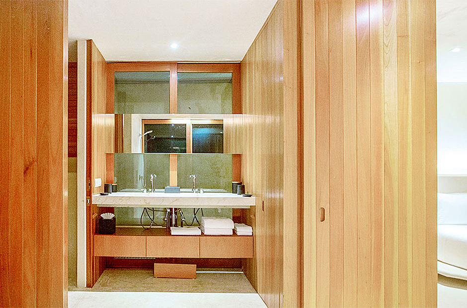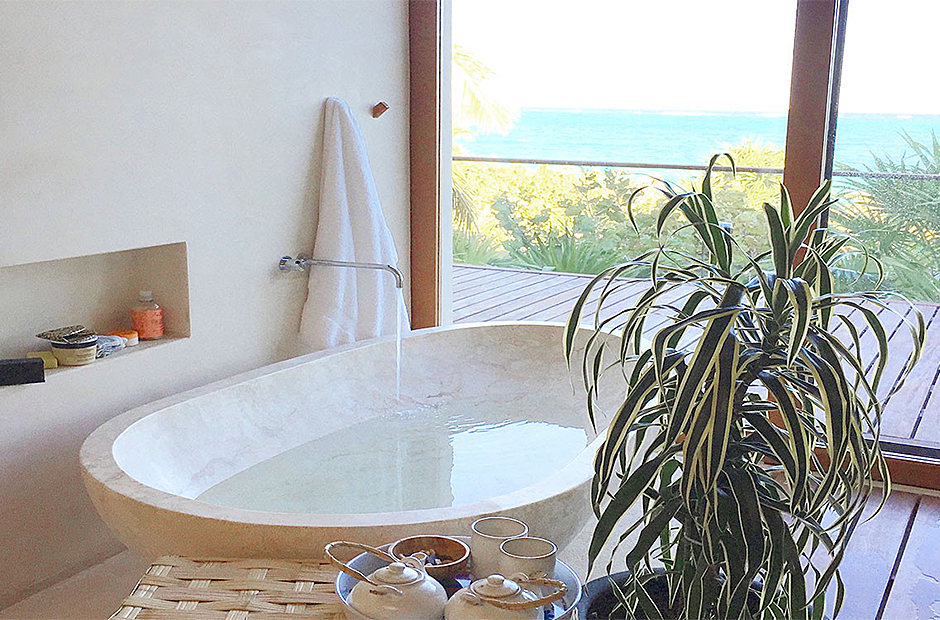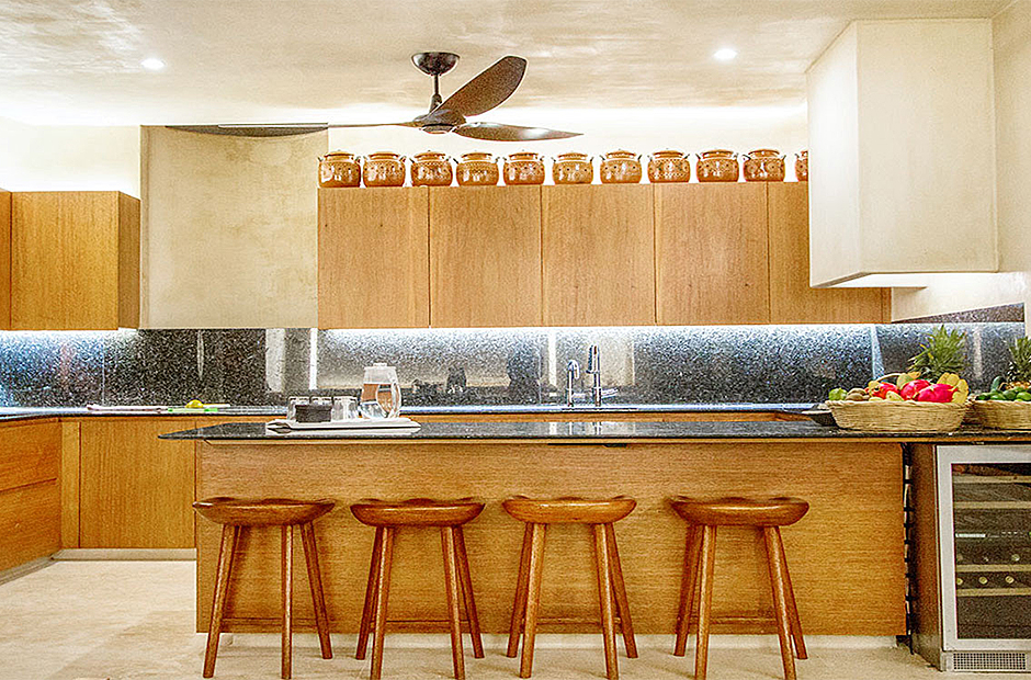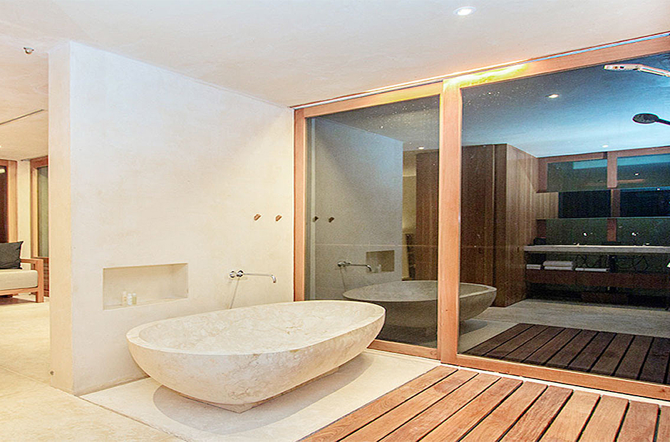 Inside, this villa offers a haven of entertainment and relaxation. Enjoy the home theatre, let loose and dance on the coffee table, or marvel at the glass-bottomed pool from above. The four master suites provide the epitome of comfort, featuring handmade stone tubs, leafy showers, and private deck spaces with sea views. Recline on the king-size beds while watching HD satellite TV, adjusting the AC and overhead fan to your liking, and raising the blackout blinds for a peaceful night's rest.