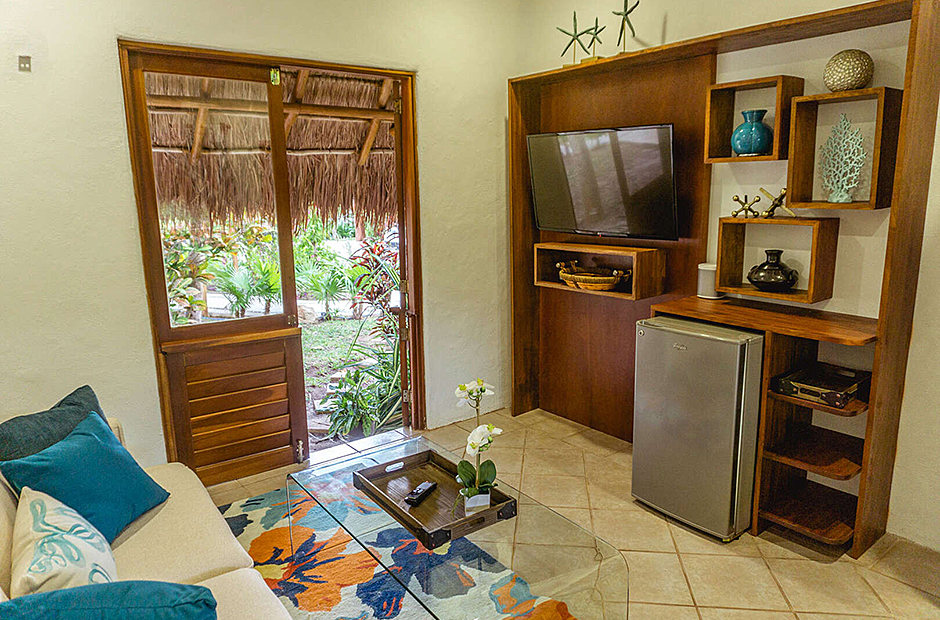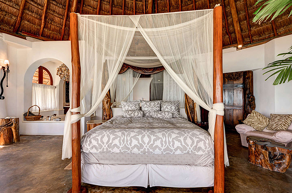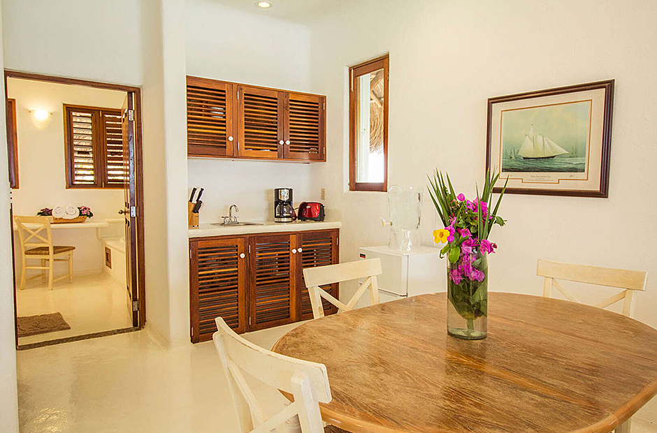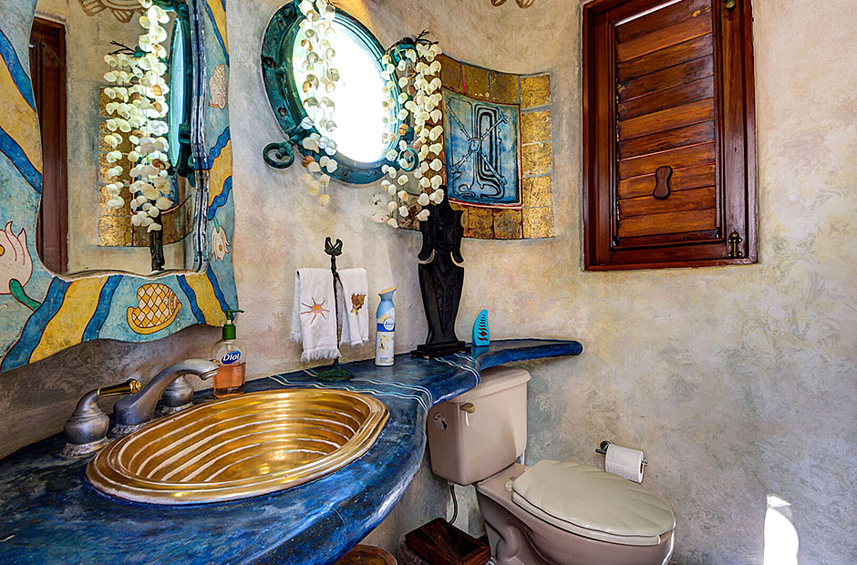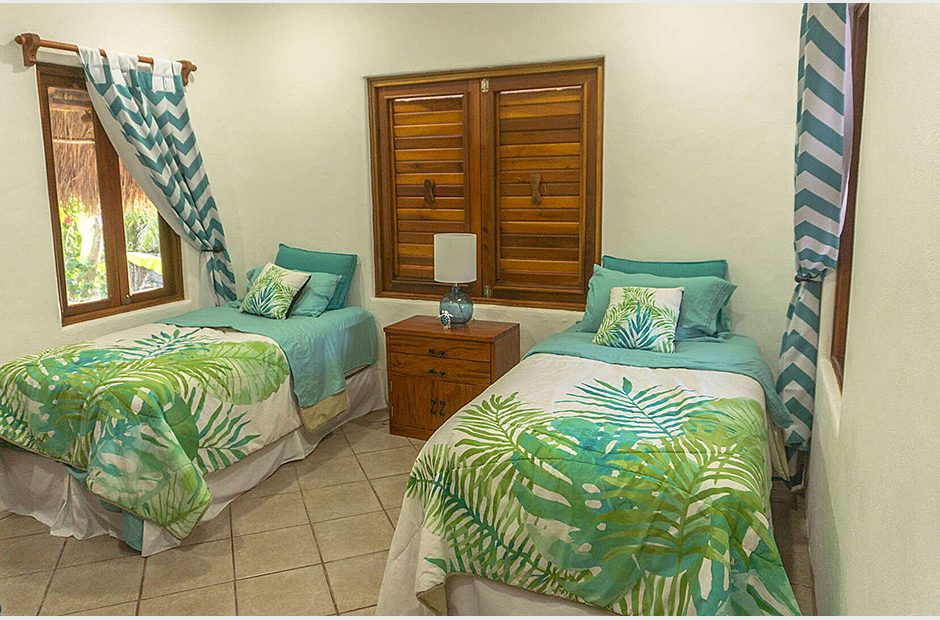 Five magnificent bedrooms accommodate up to 10 guests. Three of the bedrooms include an en suite bathroom with a Jacuzzi, air conditioning, a sitting area and a kitchenette. The fourth bedroom has an attached full bathroom and two twin beds. One of the bed frames retains the natural shape of the tree trunk and roots from which it was hewn and is a magnificent addition to an overall concept that unites modern comfort with the thrills of Caribbean nature. All bedrooms are air conditioned and the common areas where the living room and the dining room don't have air conditioning and the open the doors and the breeze helps cool the common areas.