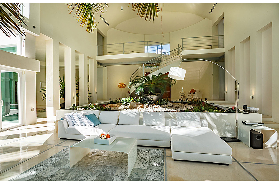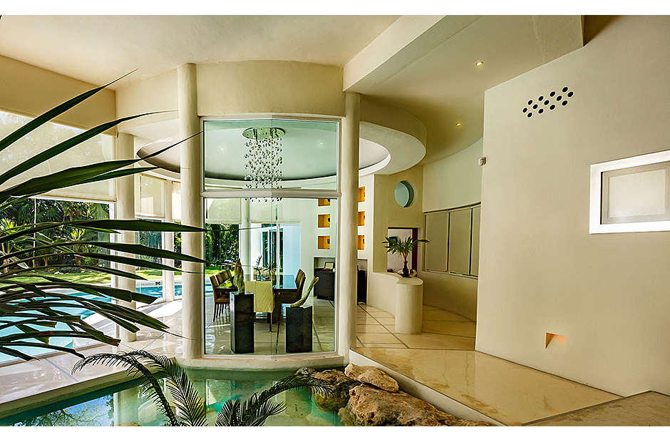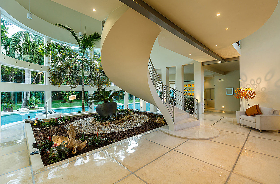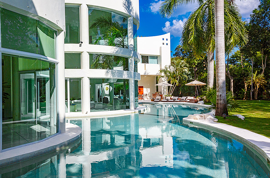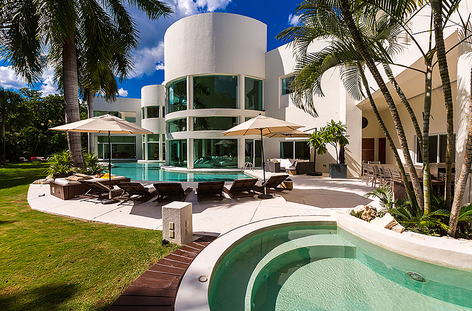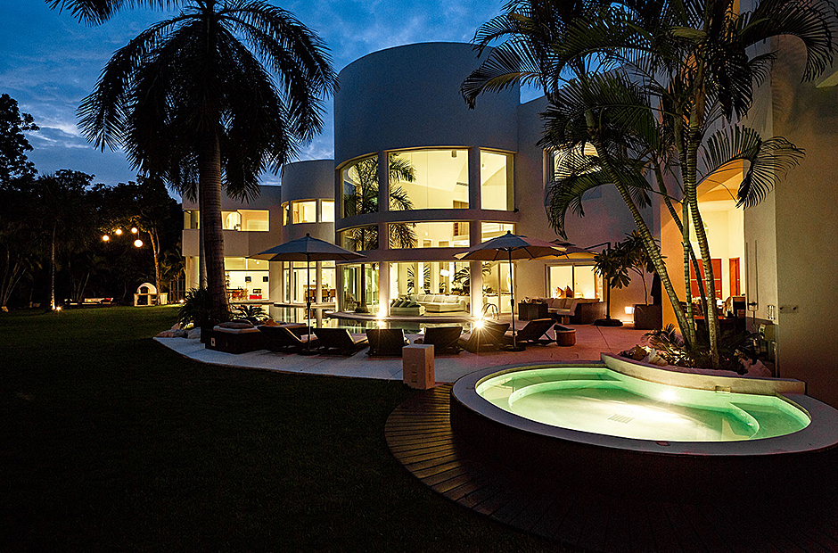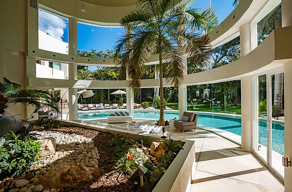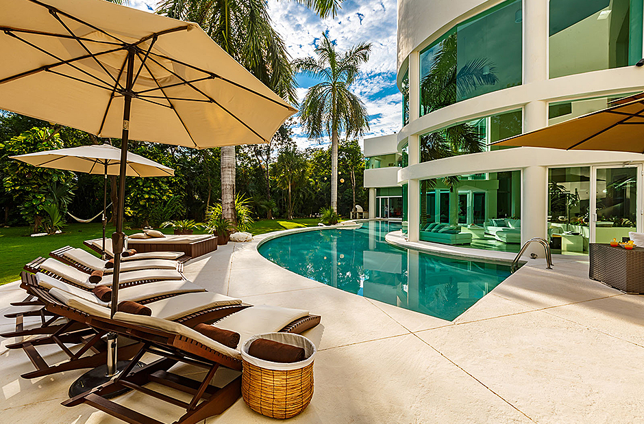 The massive swimming pool wraps around the back of the villa and faces the ocean. You can relax on a sundeck and use informal dining areas set around the backyard, surrounded by exotic flowers, plants, and large swaying palm trees.