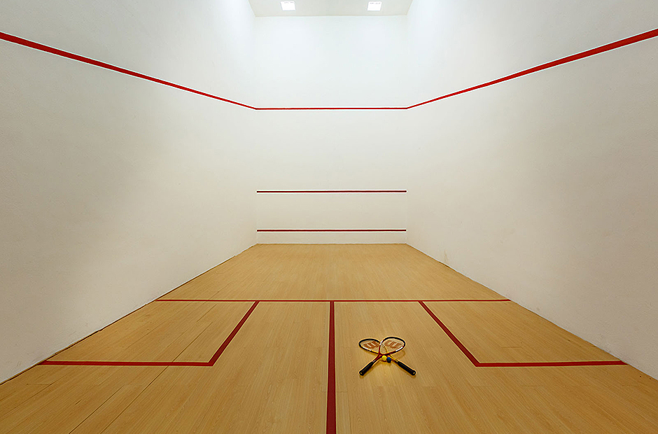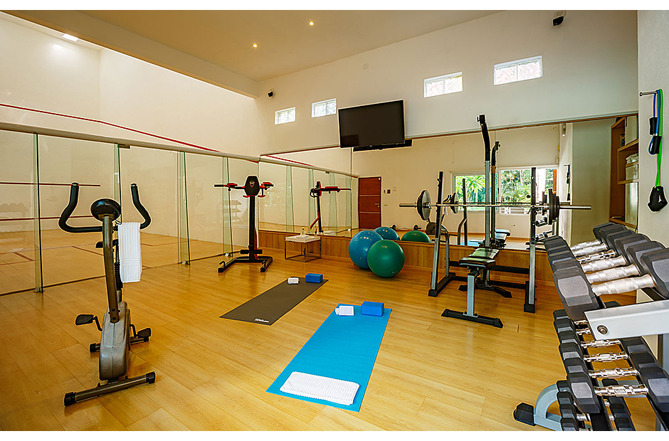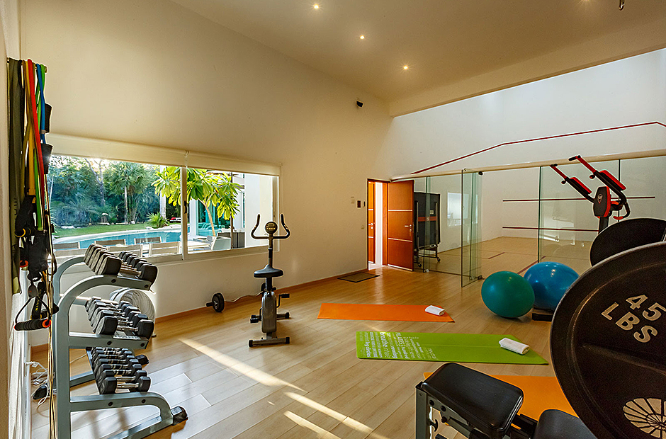 There is also a formal dining area indoors, served by a modern and spacious kitchen, with granite countertops and beautiful islands that have gorgeous views. Guests can get pumped in an indoor fitness center, as well as a squash court.