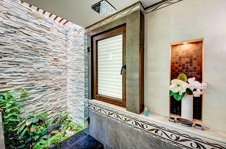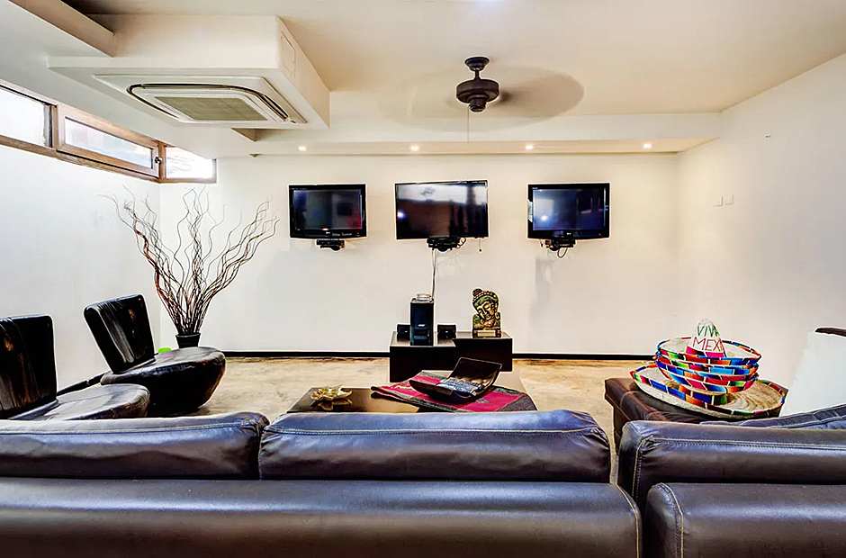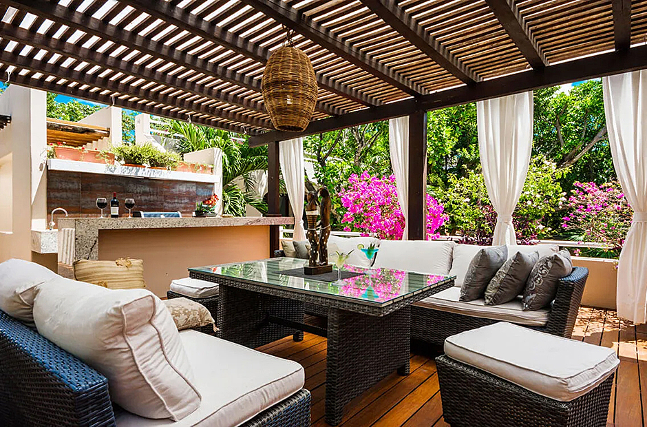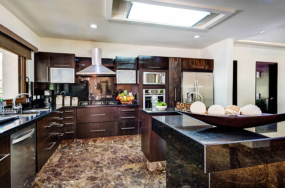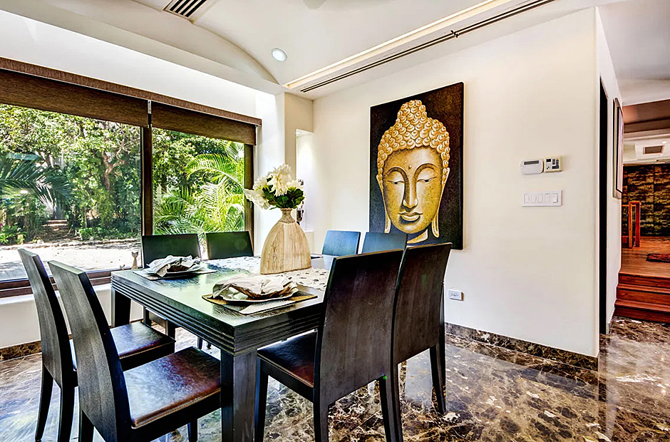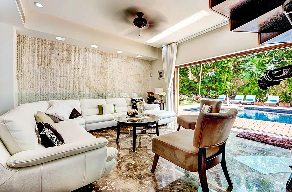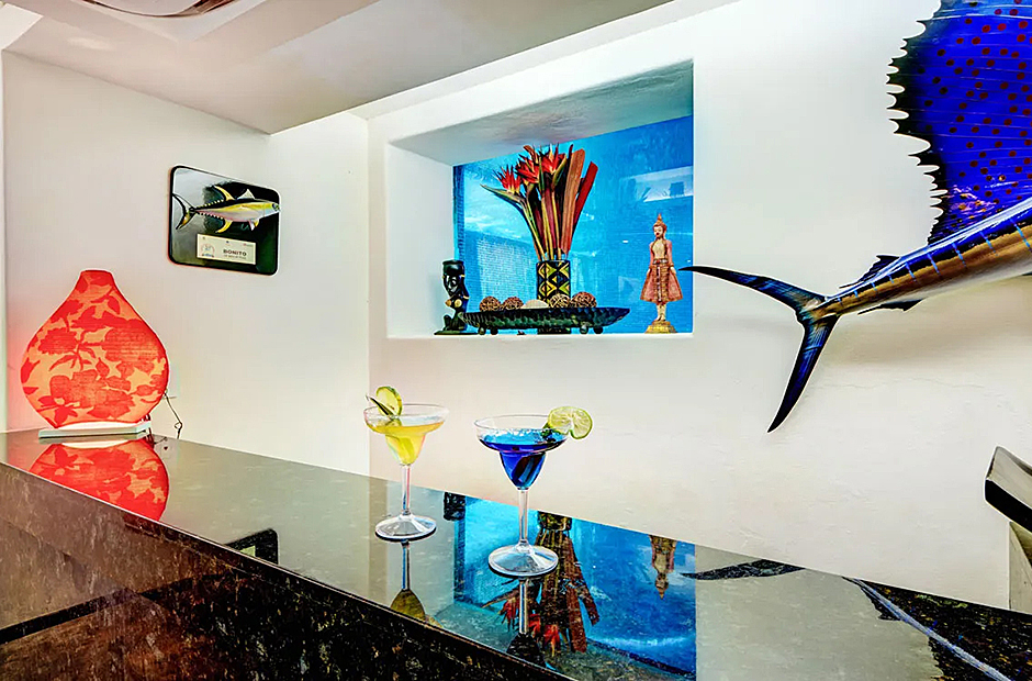 Outdoors, the villa offers a delightful array of spaces for socializing and enjoying the tropical ambiance. Indulge in a barbecue in the shaded alfresco dining area within the courtyard featuring a pool or opt for the palapa-style upper space for a unique dining experience. Inside, the villa's interior showcases a harmonious blend of elegance and comfort, with marble feature walls, warm wooden accents, and vibrant decor. The open-plan living and dining areas seamlessly integrate with a fully-furnished modern kitchen, media room, and a stylish bar.