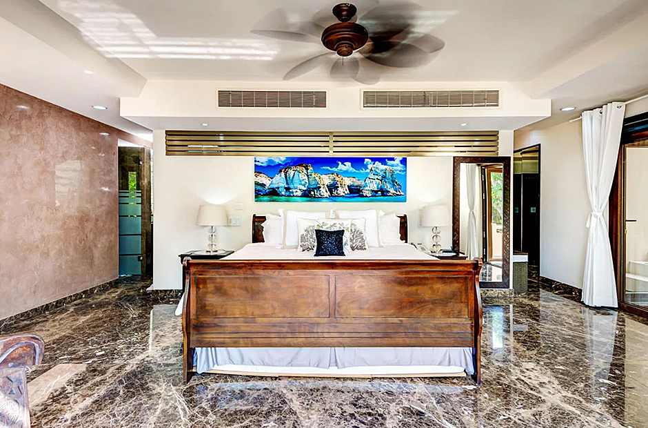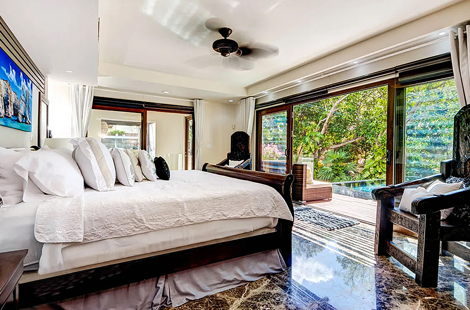 The villa's ensuite bedroom suites are generously airy and spacious, enveloping a charming courtyard that adds to the villa's sense of privacy and cohesion. On the upper level, the master bedroom takes luxury to new heights, featuring an ocean-view terrace and its own additional infinity pool for an indulgent escape. Meanwhile, the lower-level bedrooms open to garden terraces and the main pool, creating serene retreats for relaxation.