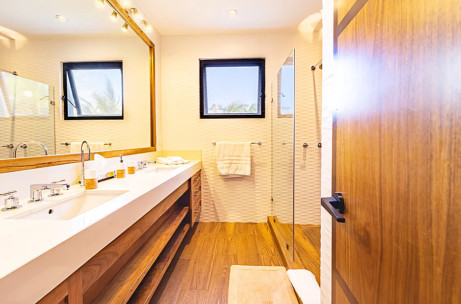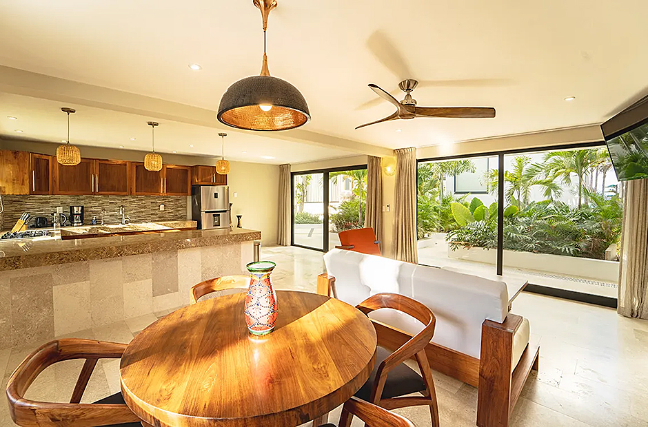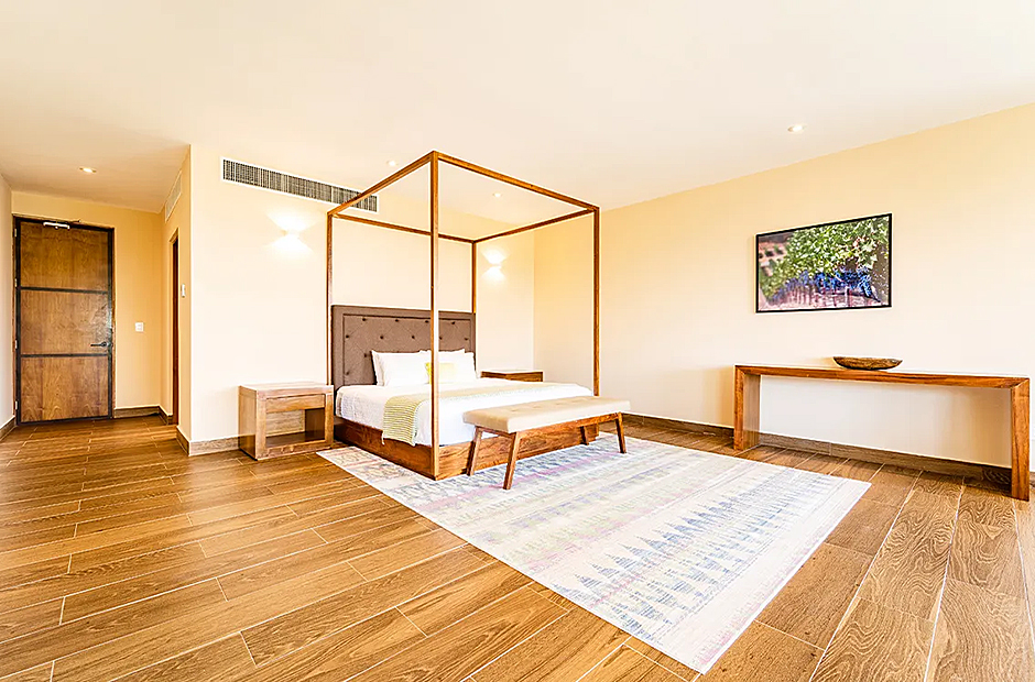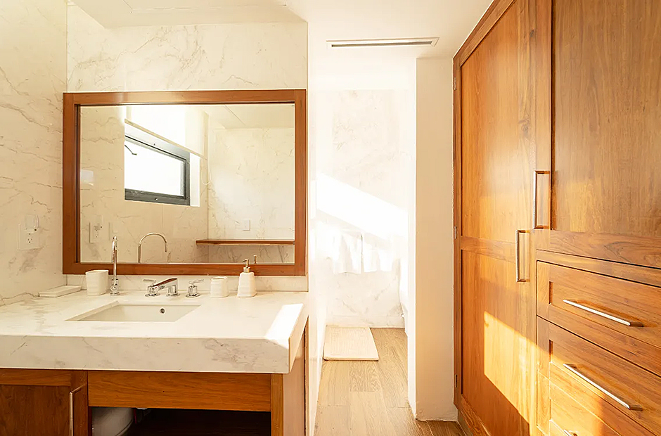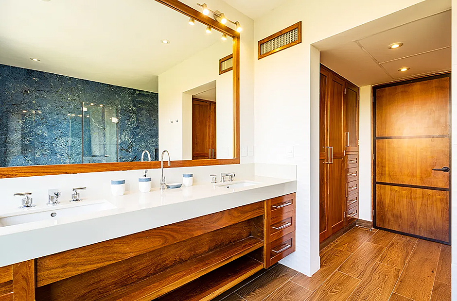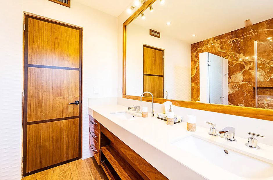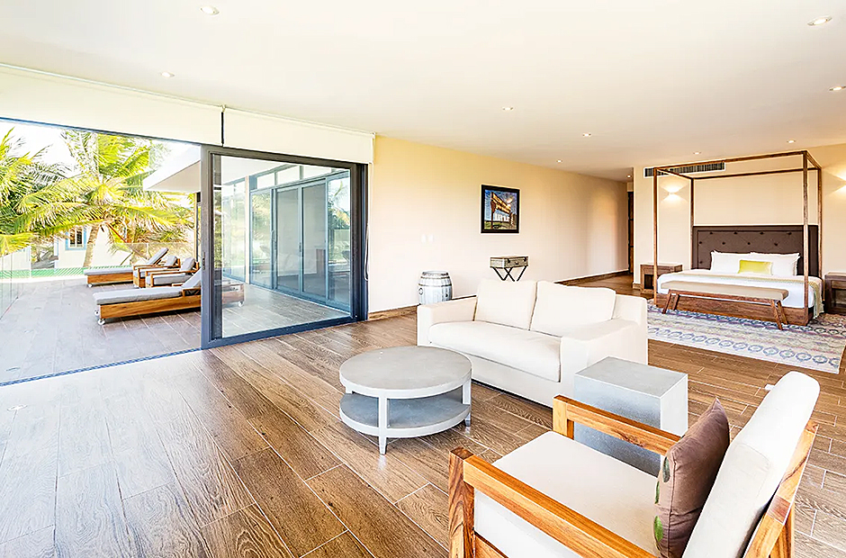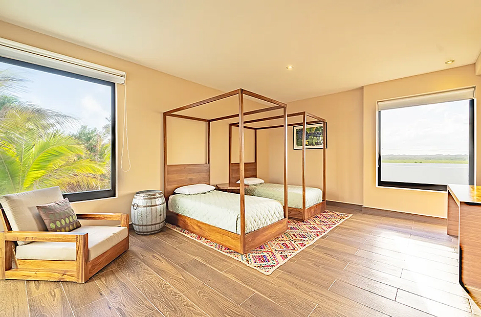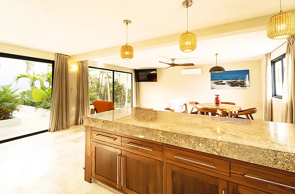 The interiors are thoughtfully designed with natural Tzalam wood finishes and furniture, harmoniously paired with locally sourced natural stone and Italian ceramic tiles. This harmonious blend gives the space a sophisticated feel, while fully embracing the surrounding natural beauty. Notable art pieces from some of Mexico's renowned painters further enrich the aesthetic appeal of the lower floor.