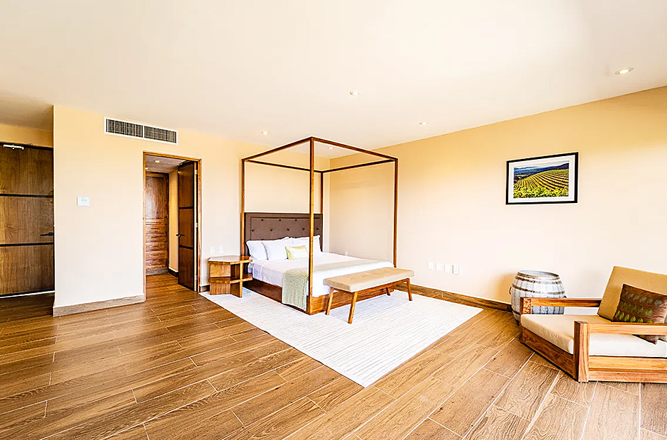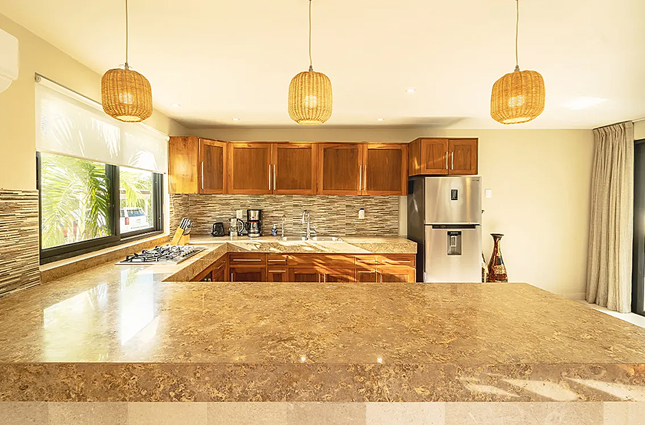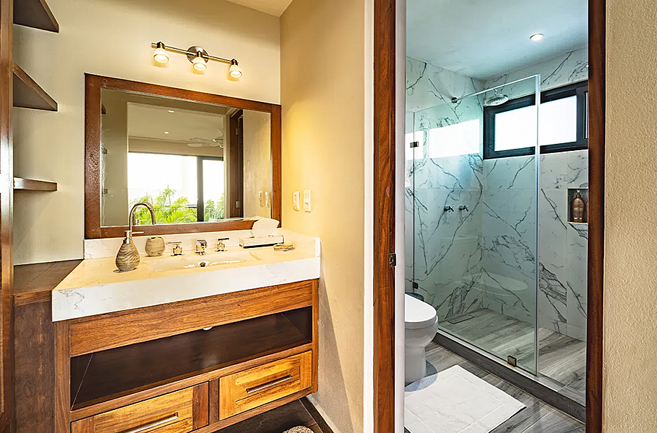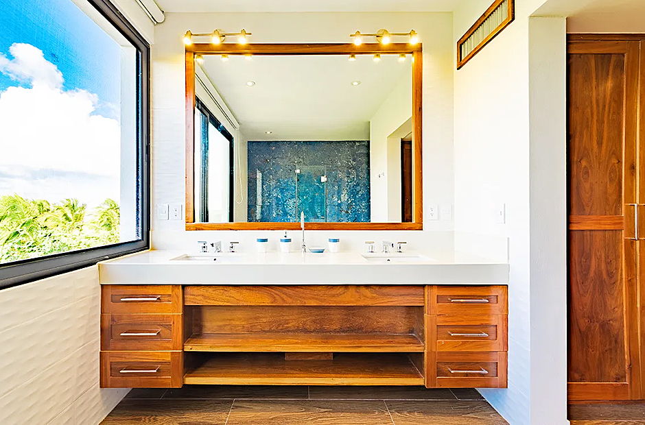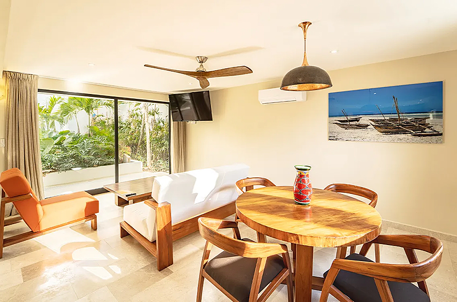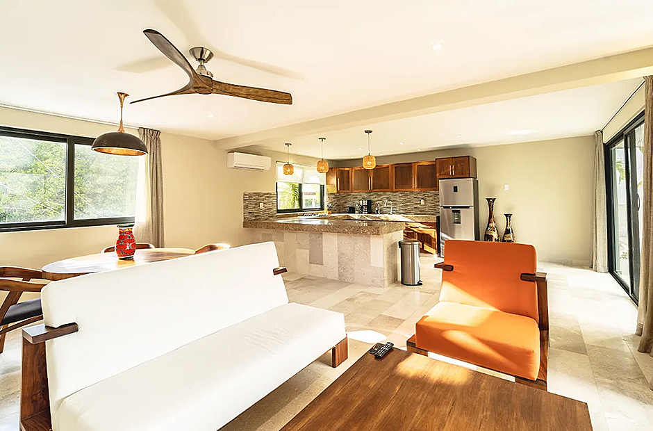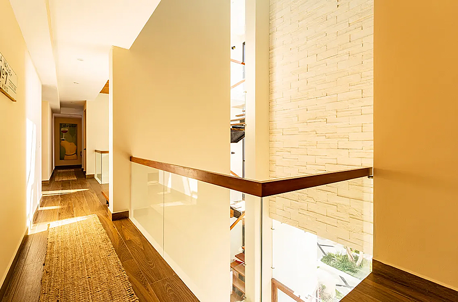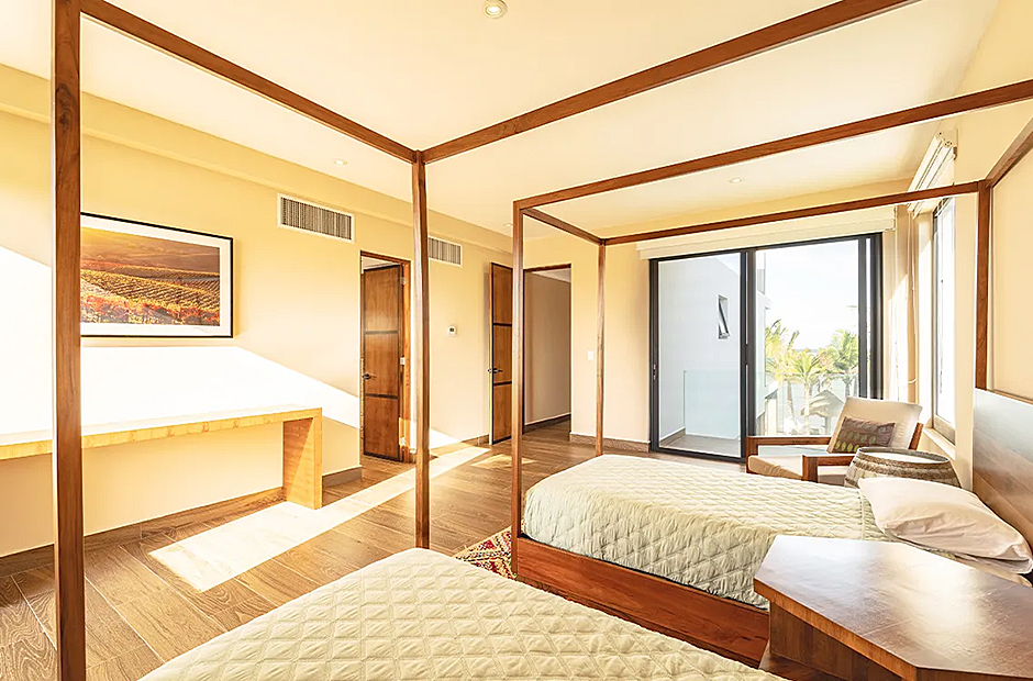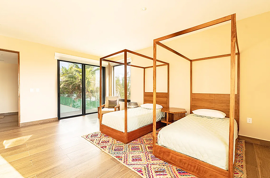 The interiors are thoughtfully designed with natural Tzalam wood finishes and furniture, harmoniously paired with locally sourced natural stone and Italian ceramic tiles. This harmonious blend gives the space a sophisticated feel, while fully embracing the surrounding natural beauty. Notable art pieces from some of Mexico's renowned painters further enrich the aesthetic appeal of the lower floor.