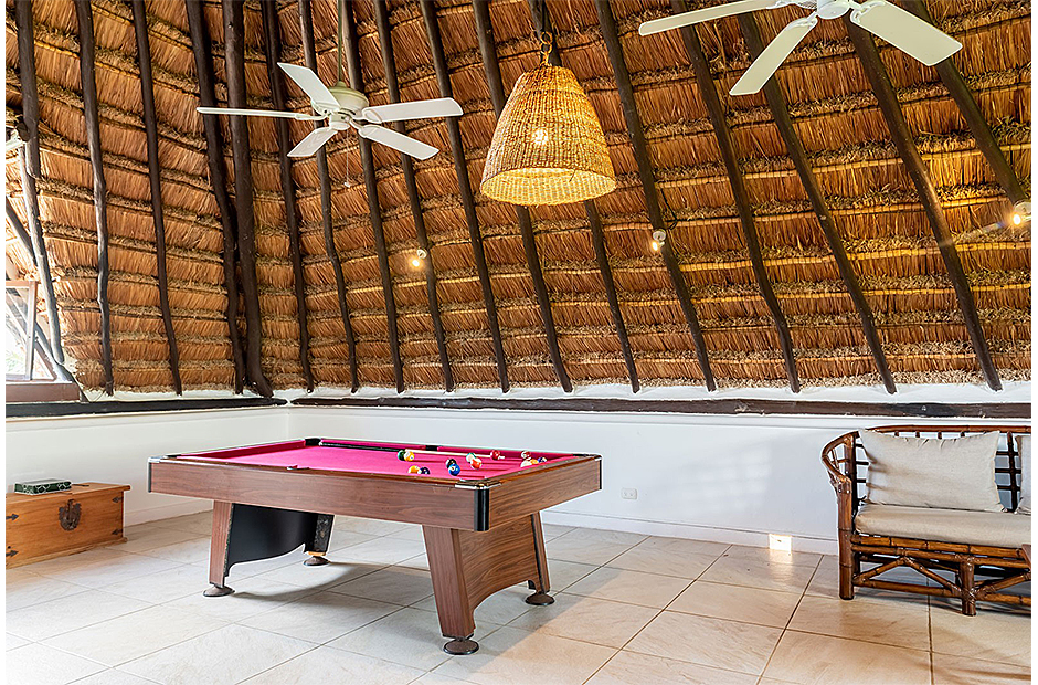 The villa can accommodate up to 16 people, offering both independence via private room entrances and intimacy with large communal areas for the entire group to enjoy. It even has a game room with a pool table, chess, and darts. But of course, you might want to spend your days outdoors in the spectacular pool and deck, just a few meters away from a private beach stretch fitted with sun loungers and hammocks.