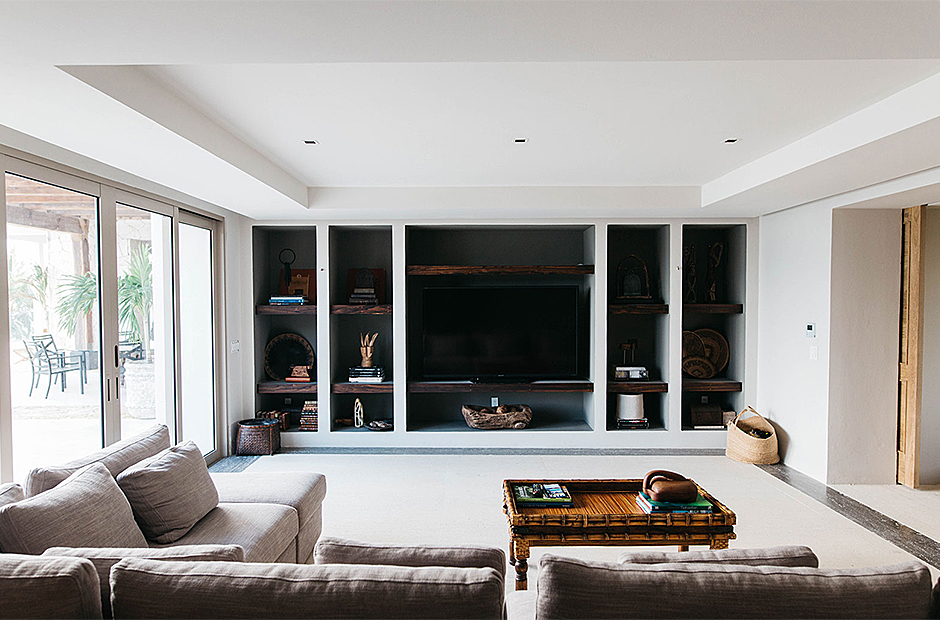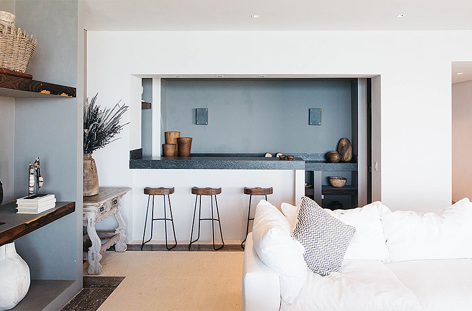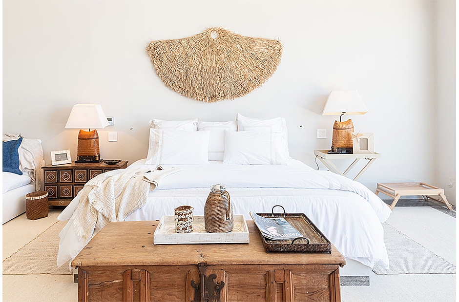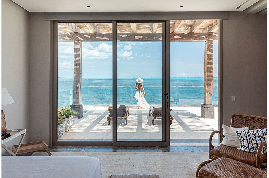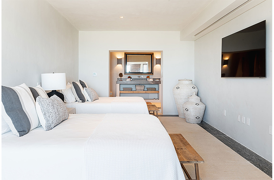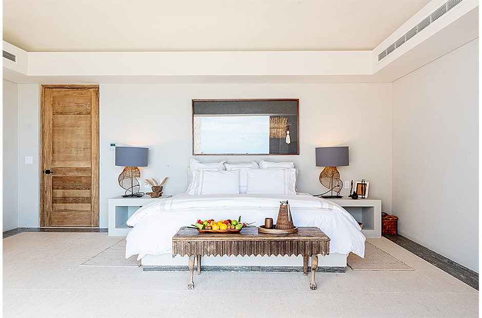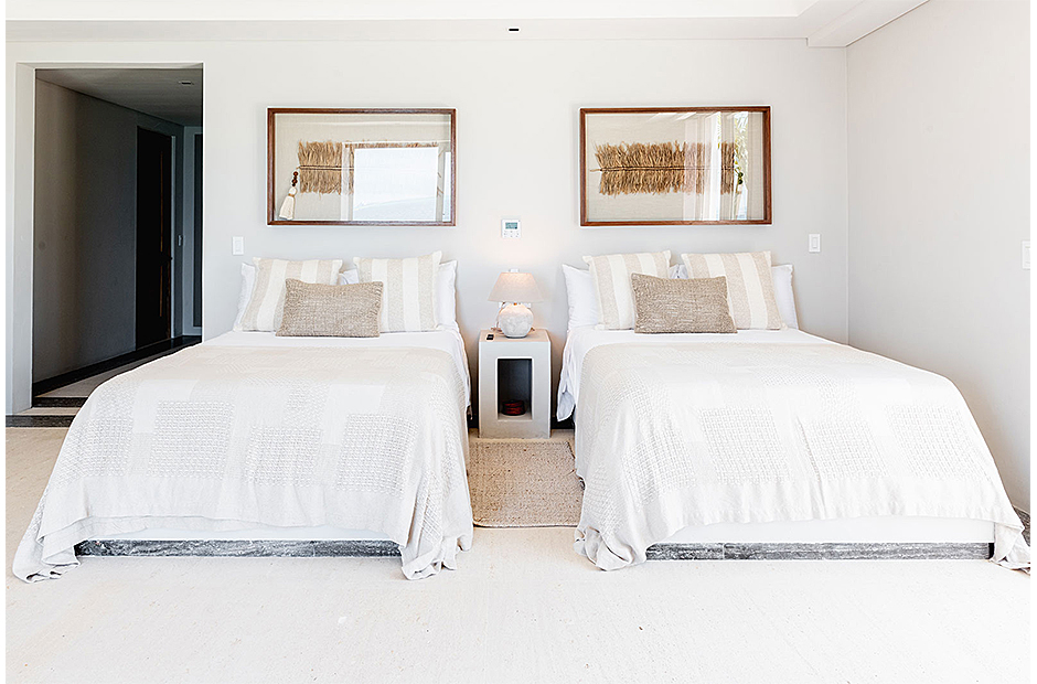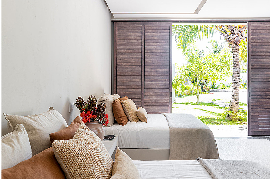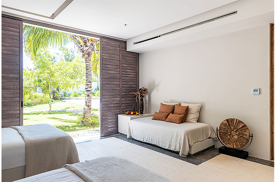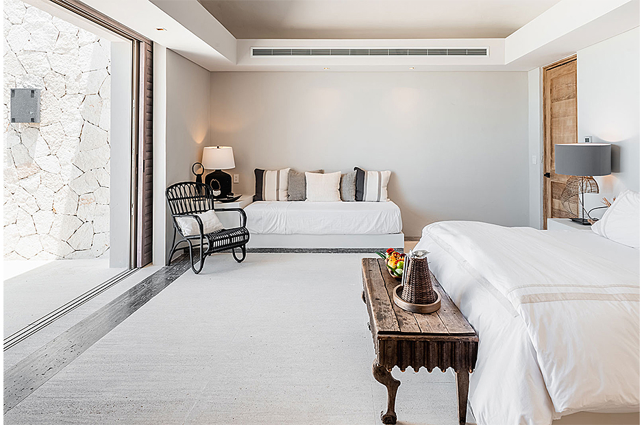 Take it private or go big, with a mix of king rooms boasting oceanfront balconies and larger double bedrooms for up to six people. All rooms offer a minimalist approach with practical extra bedding. Six of the bedrooms are in the main house, with the seventh offering private access at beach level and an eighth bungalow room.