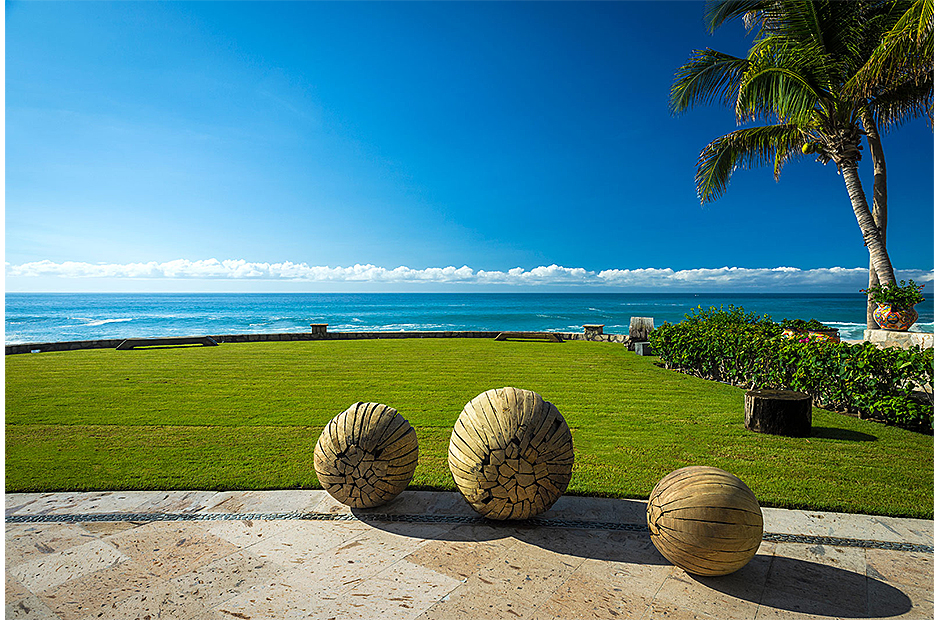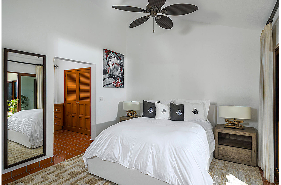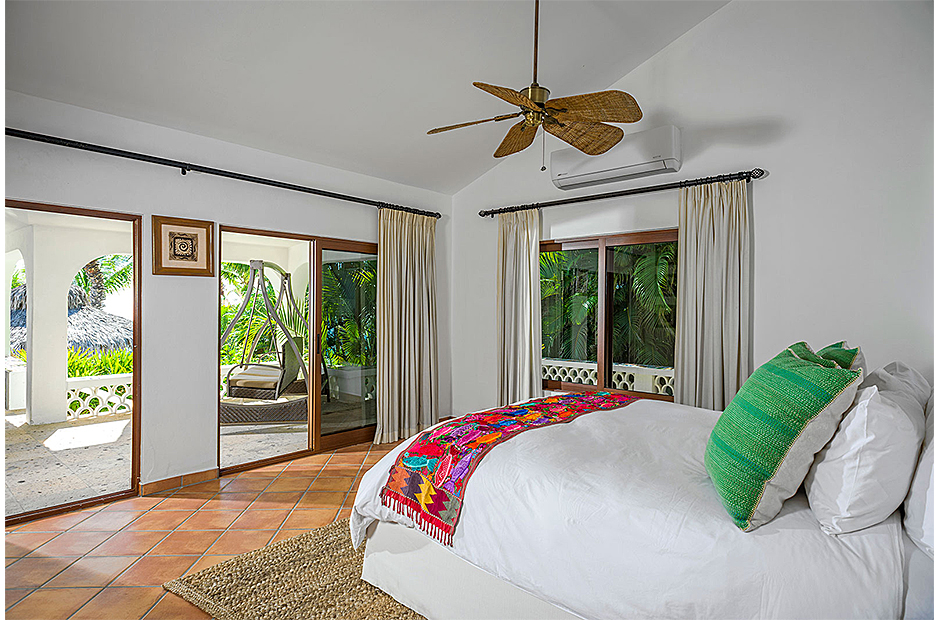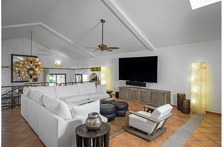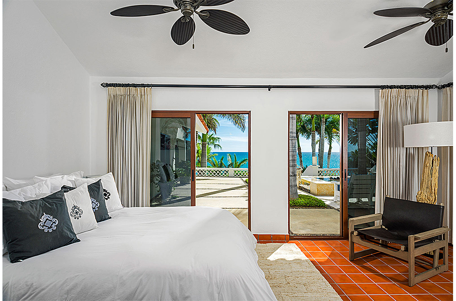 The main house spans 6,000 square feet and features a spacious living room with a 70-inch plasma TV and a bar adjacent to the dining area, which seats twelve or more guests. Four bedrooms surround the great room, with an additional bedroom and the master suite adjacent, all opening to a charming fountain courtyard. Another bedroom and bath, located behind the kitchen, are perfect for staff. All guest bedrooms offer breathtaking ocean views and private en suite baths. A new addition below the pool and spa level includes two additional bedroom suites, an outdoor kitchen, bar, and eating area, alongside a large lawn that covers the brand new 4,400 square foot private gym at beach level. With 8.5 bathrooms, 5 king beds, 1 queen bed, and 4 twin beds, this villa comfortably accommodates up to 16 guests within its 12,000 square feet of luxurious living space.
