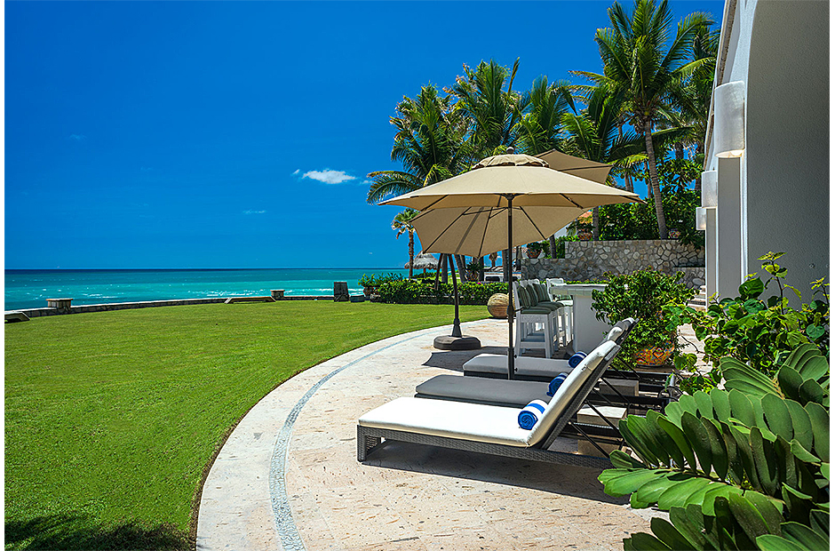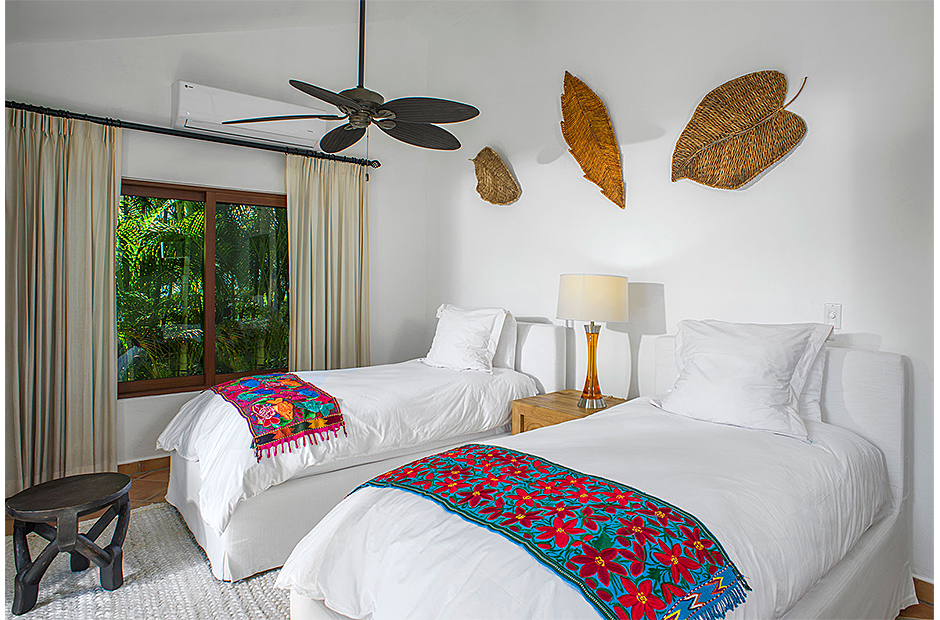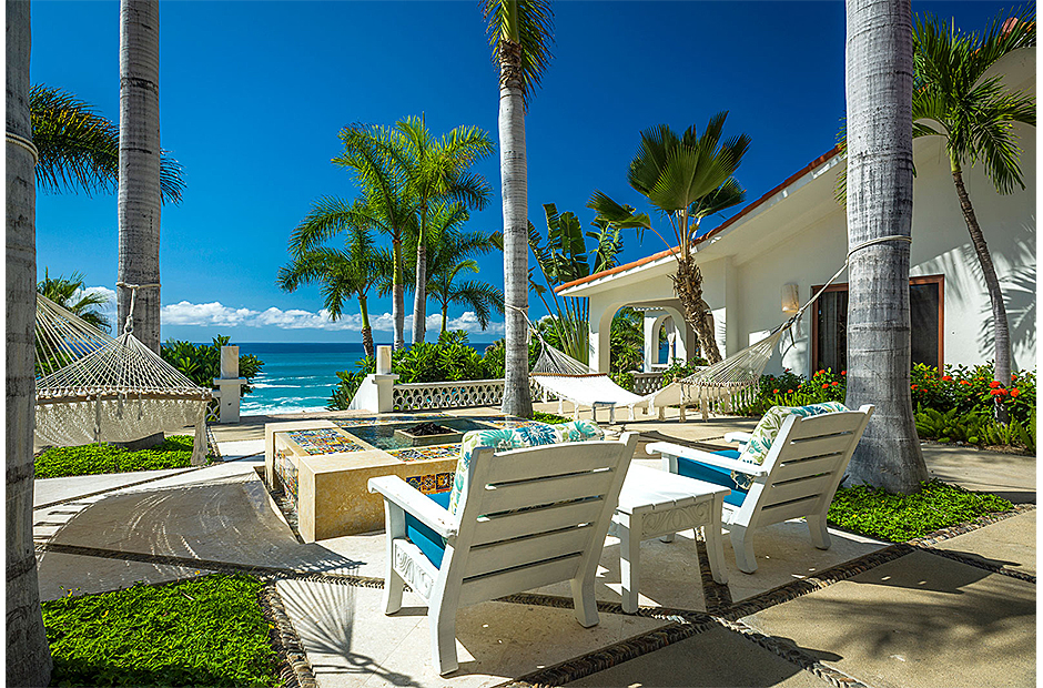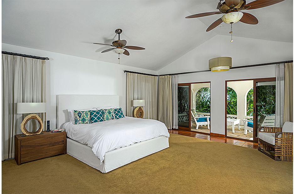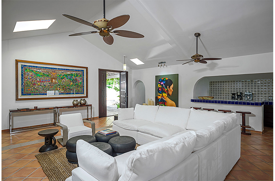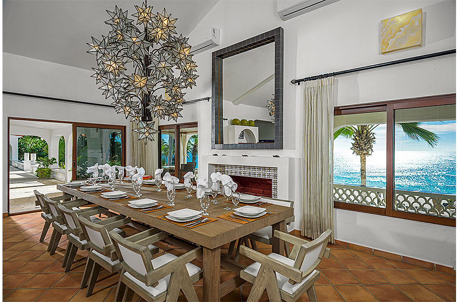 The main house spans 6,000 square feet and features a spacious living room with a 70-inch plasma TV and a bar adjacent to the dining area, which seats twelve or more guests. Four bedrooms surround the great room, with an additional bedroom and the master suite adjacent, all opening to a charming fountain courtyard. Another bedroom and bath, located behind the kitchen, are perfect for staff. All guest bedrooms offer breathtaking ocean views and private en suite baths. A new addition below the pool and spa level includes two additional bedroom suites, an outdoor kitchen, bar, and eating area, alongside a large lawn that covers the brand new 4,400 square foot private gym at beach level. With 8.5 bathrooms, 5 king beds, 1 queen bed, and 4 twin beds, this villa comfortably accommodates up to 16 guests within its 12,000 square feet of luxurious living space.