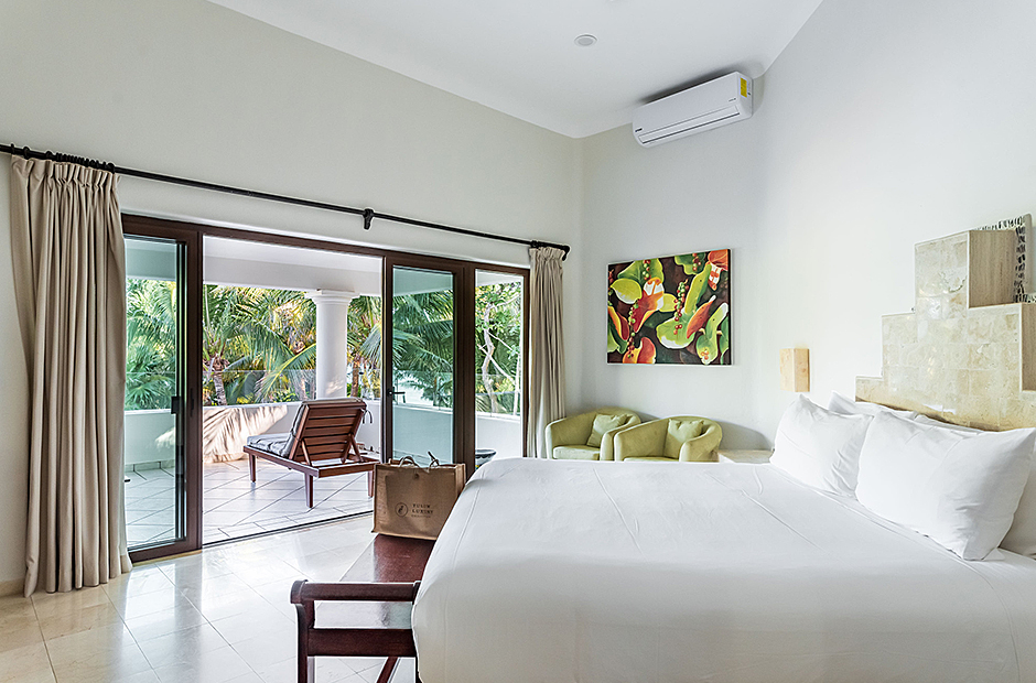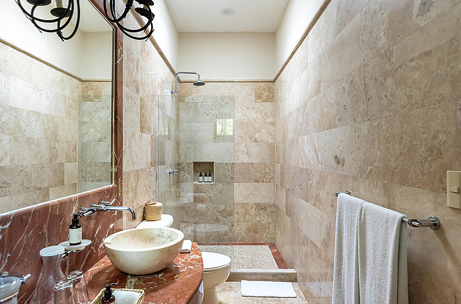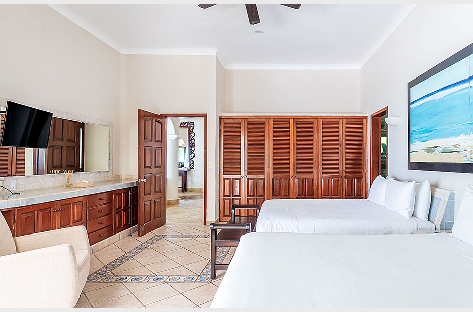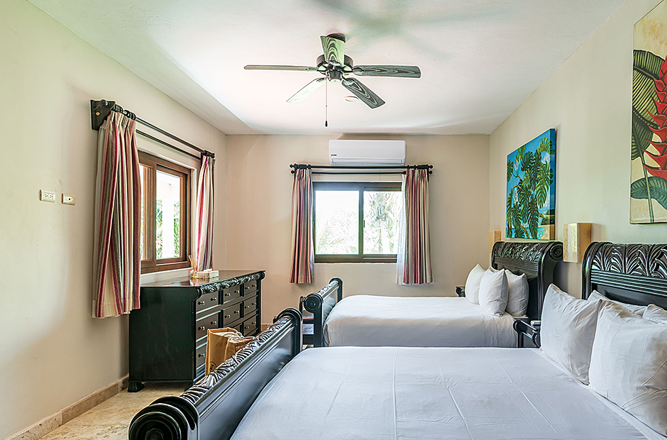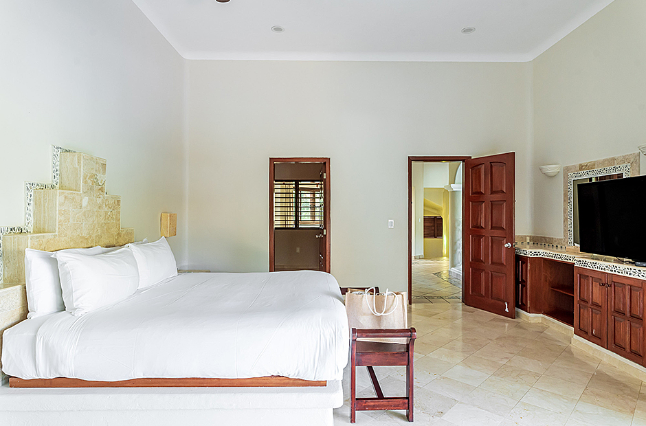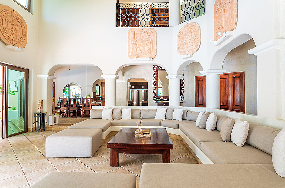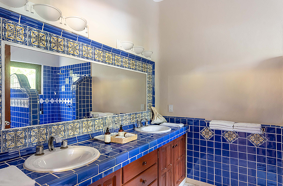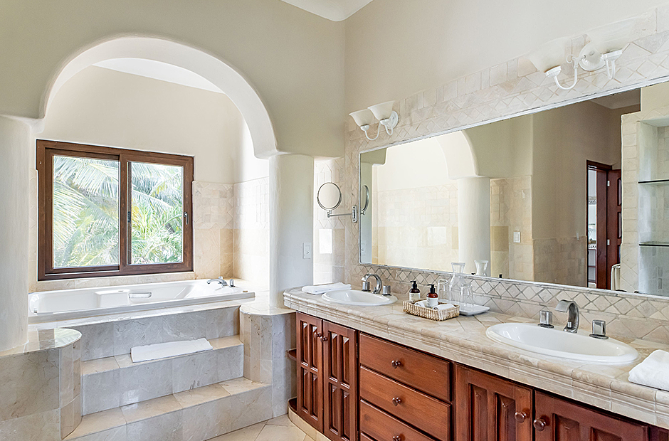 Each of the nine bedrooms are equipped with ceiling fans, satellite TV, a DVD player, and a security safe. The villas decor was inspired by Mexican architecture and craftsmanship. Every bedroom has its own private luxurious marble bathroom and the master bathroom has a Jacuzzi tub with an incredible view of the Caribbean.