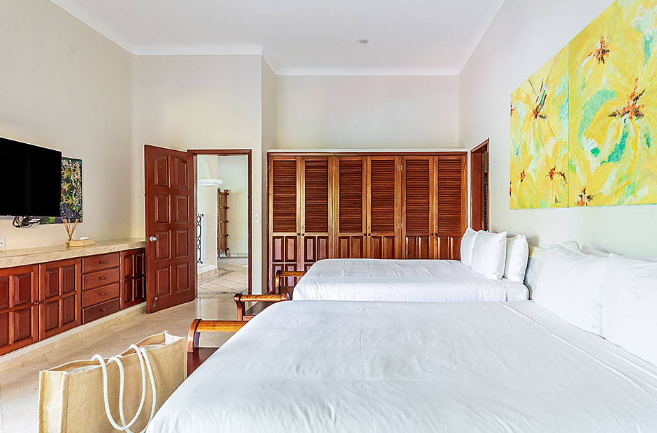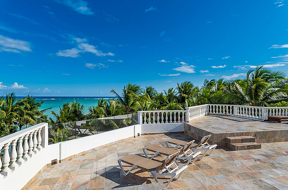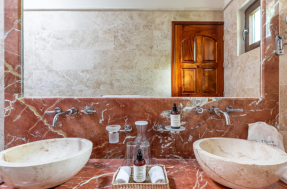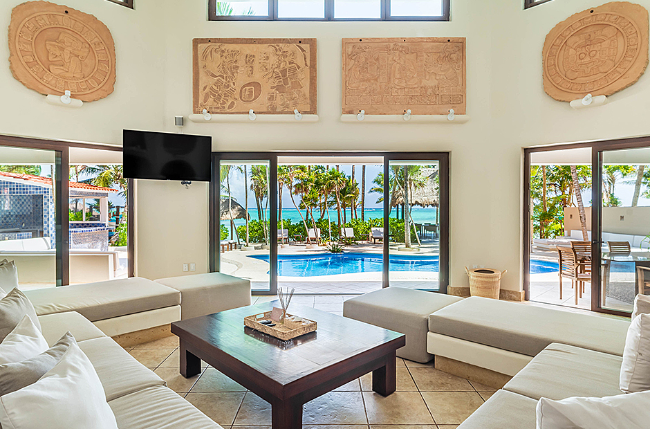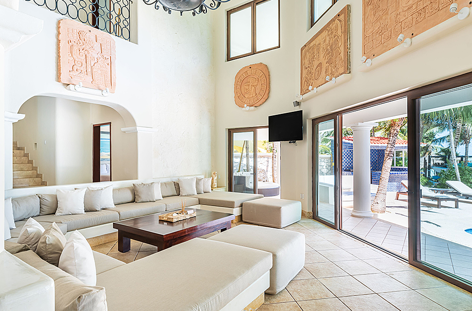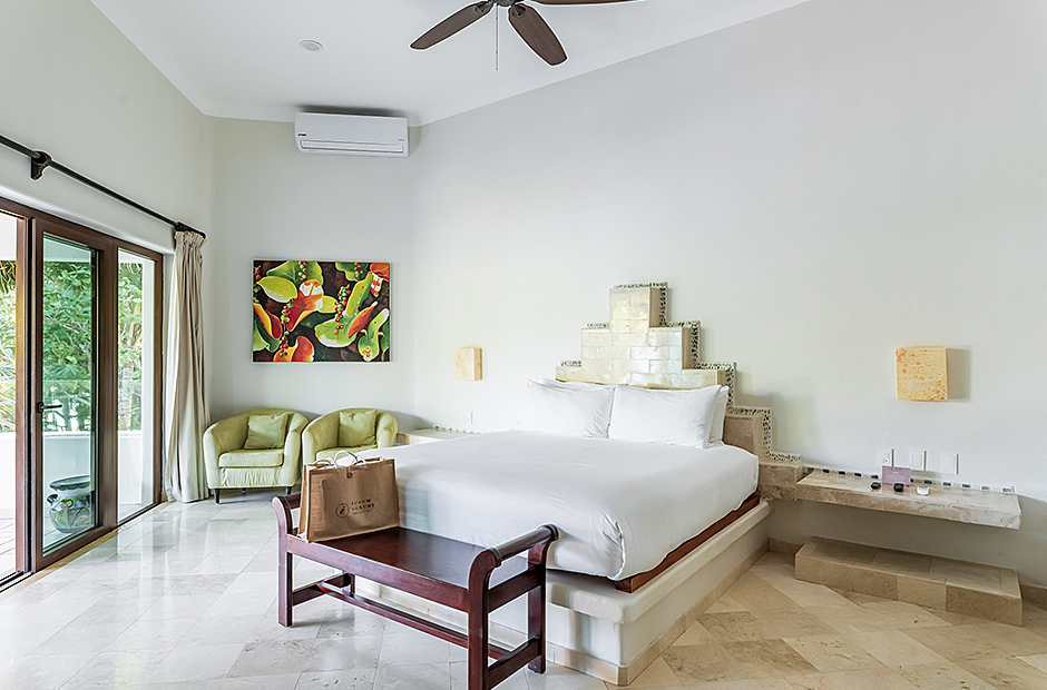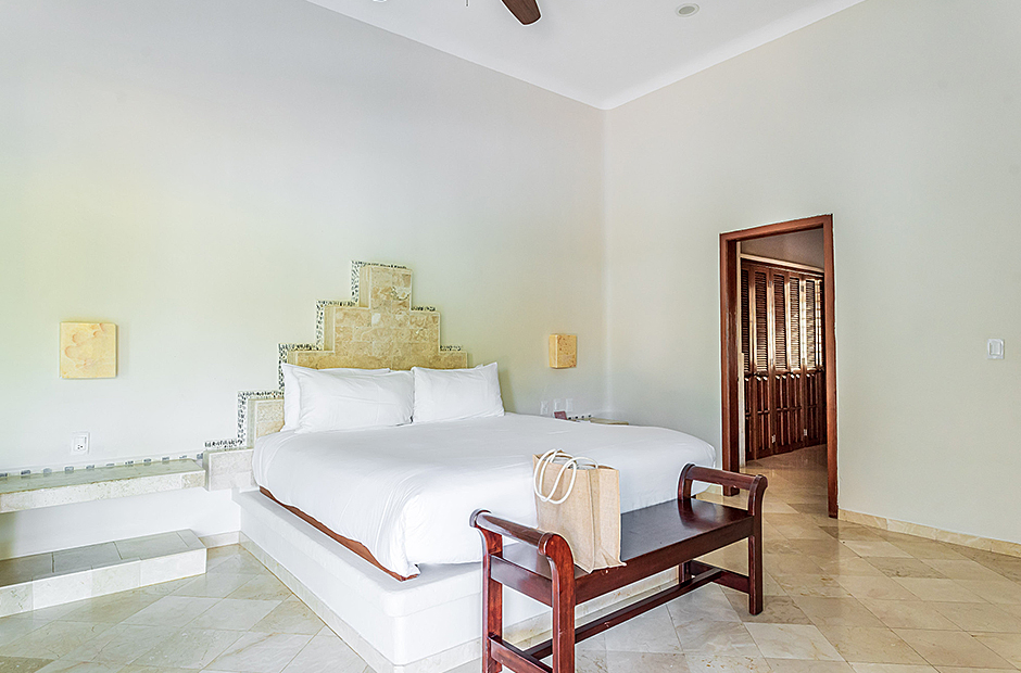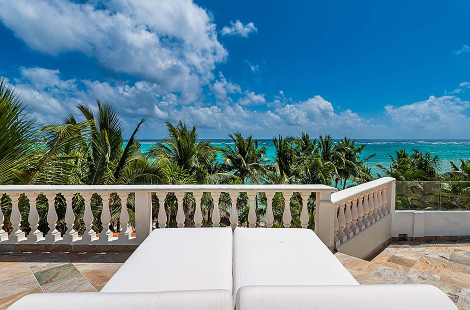 Each of the nine bedrooms are equipped with ceiling fans, satellite TV, a DVD player, and a security safe. The villas decor was inspired by Mexican architecture and craftsmanship. Every bedroom has its own private luxurious marble bathroom and the master bathroom has a Jacuzzi tub with an incredible view of the Caribbean.