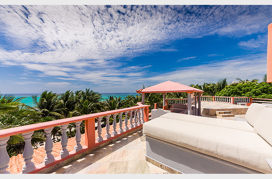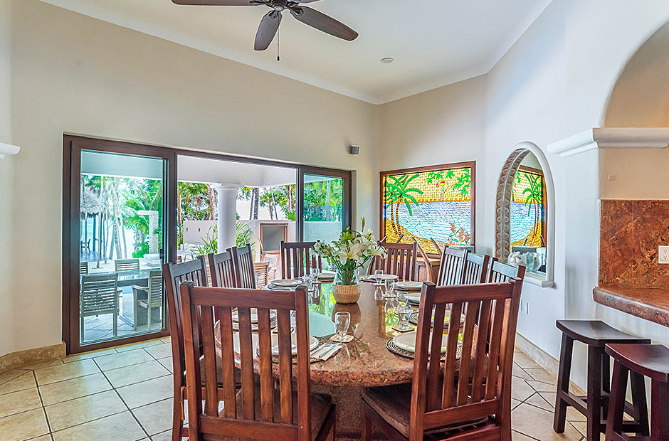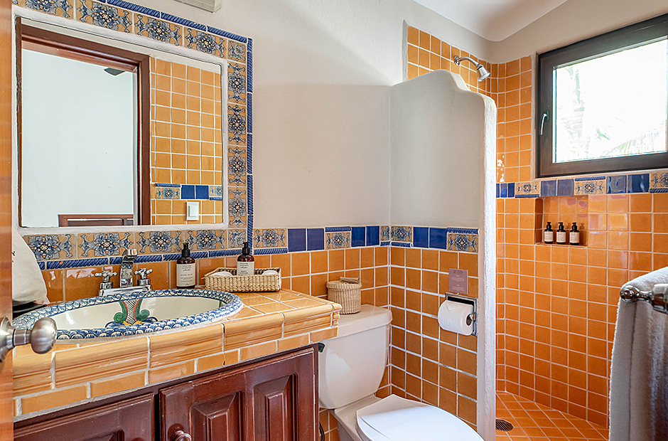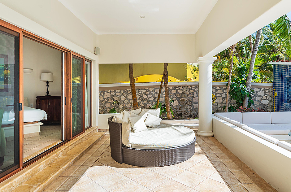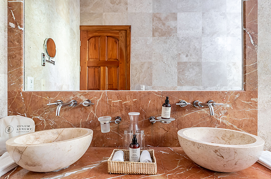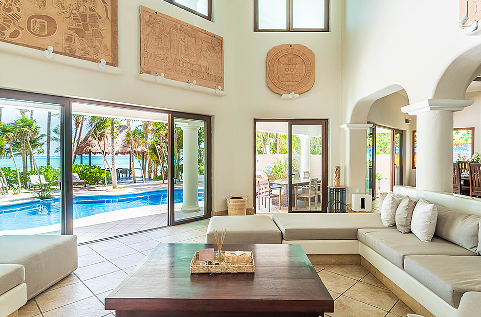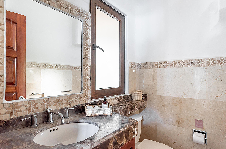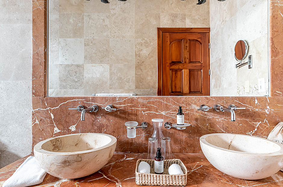 Each of the nine bedrooms are equipped with ceiling fans, satellite TV, a DVD player, and a security safe. The villas decor was inspired by Mexican architecture and craftsmanship. Every bedroom has its own private luxurious marble bathroom and the master bathroom has a Jacuzzi tub with an incredible view of the Caribbean.