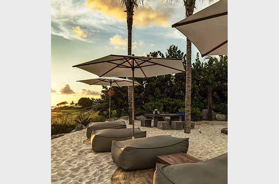 The beautifully landscaped garden, adorned with lush tropical plants, seamlessly extends into a spacious terrace at the rear of the property, where an angular infinity-edge pool offers breathtaking views of the bay. In the evening, exterior lighting enhances the allure of the cool waters, making a night-time swim under the stars all the more tempting. Sun loungers line the pool's edge, providing the perfect spot for sunbathing. Just below the pool's vista, a secluded sand terrace awaits, surrounded by comfortable beach chairs and a cozy fire pit, culminating in an intimate setting for relaxation.