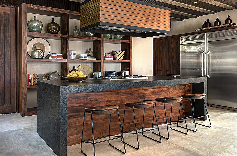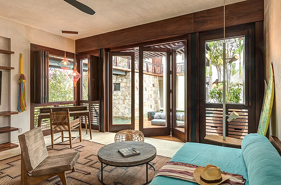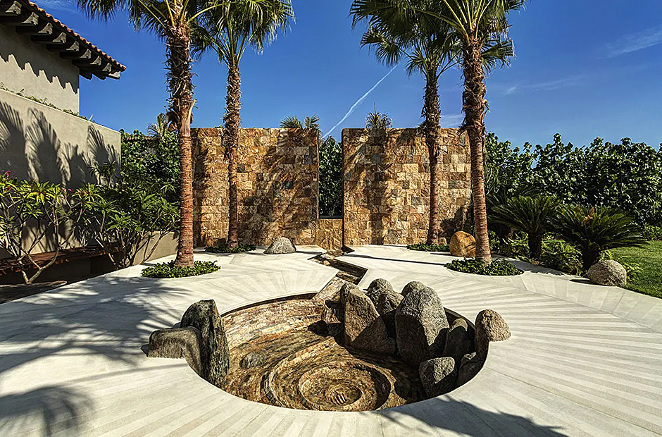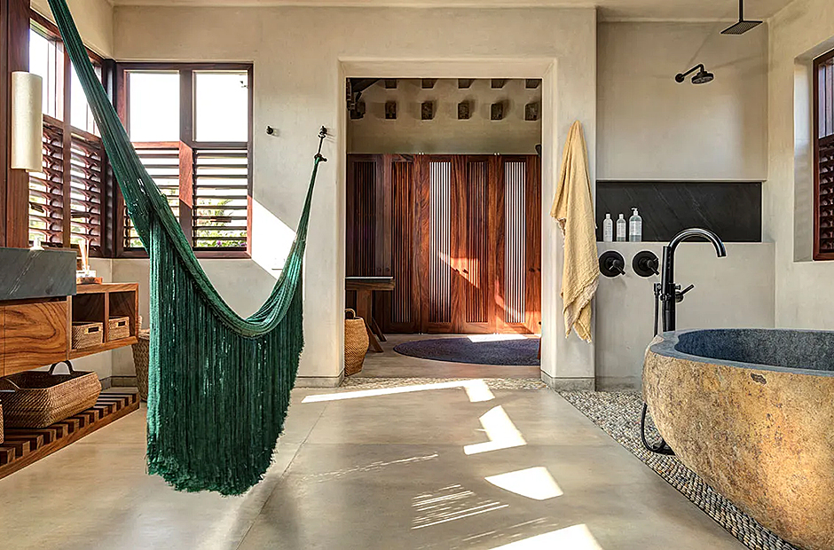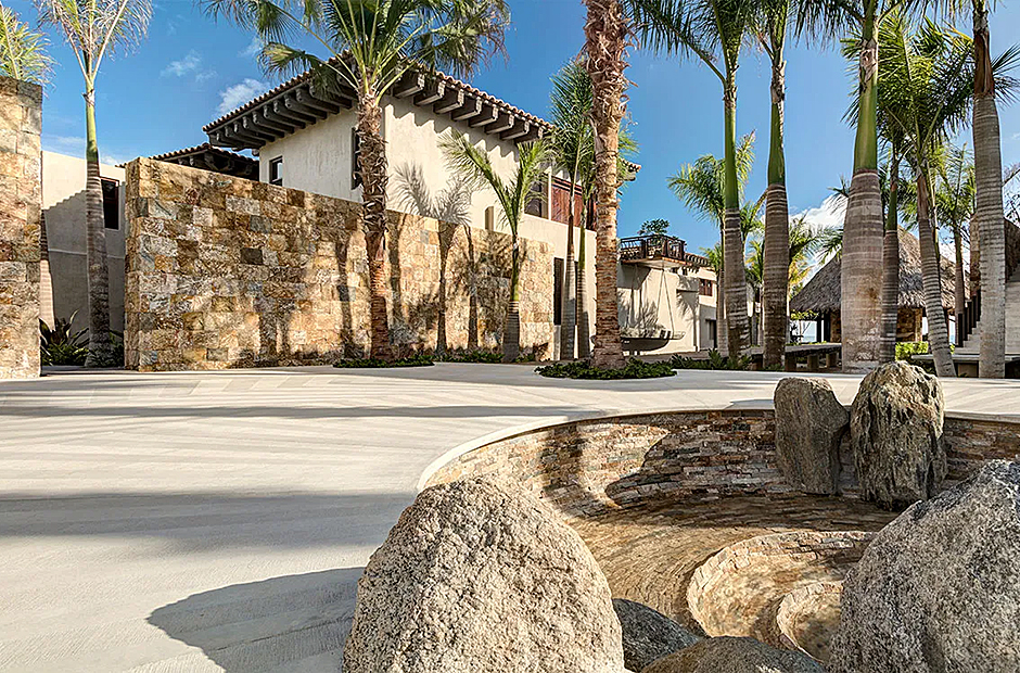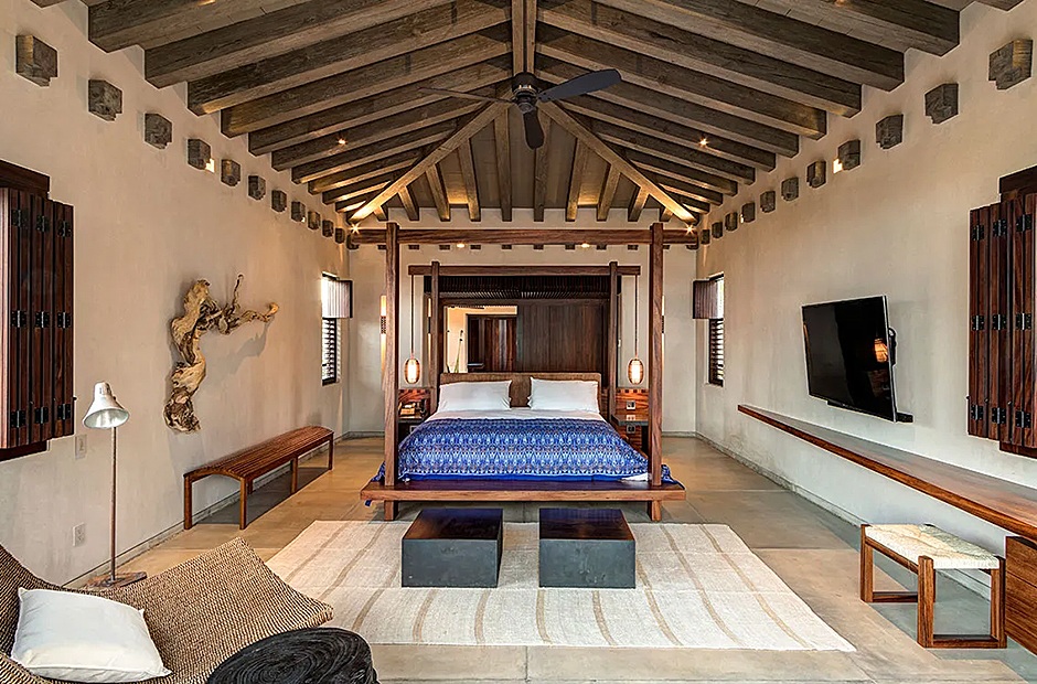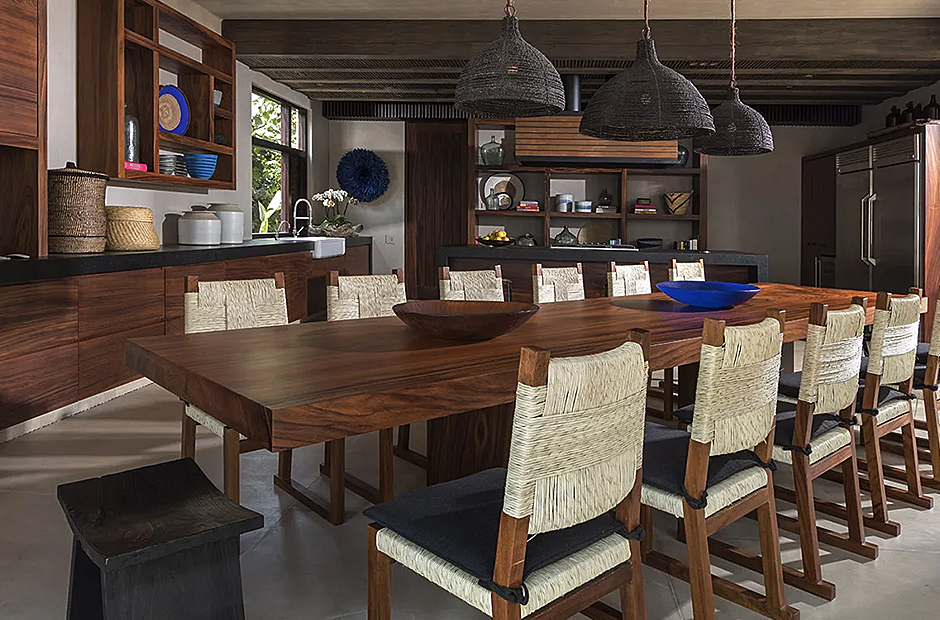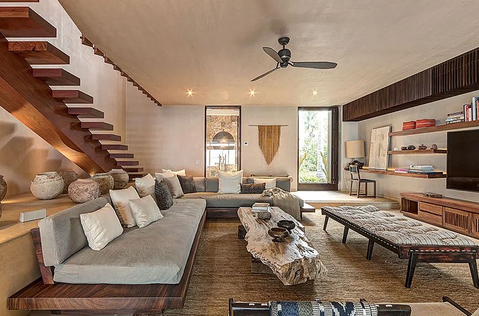 Upon arrival, you'll be greeted by a captivating radial pattern stone patio that leads to a boardwalk guiding you to the heart of the casa—the expansive palapa. Crafted using local materials and construction techniques, the palapa's beach hut motif is thoughtfully mirrored throughout the design, with a graceful palm-thatched roof extending over the dining terrace, surrounded by mature palm trees swaying gently in the breeze. Seamlessly blending indoor and outdoor living, the dining terrace boasts a multitude of plush couches and chairs, creating the perfect setting for meals, casual conversations, or entertainment.