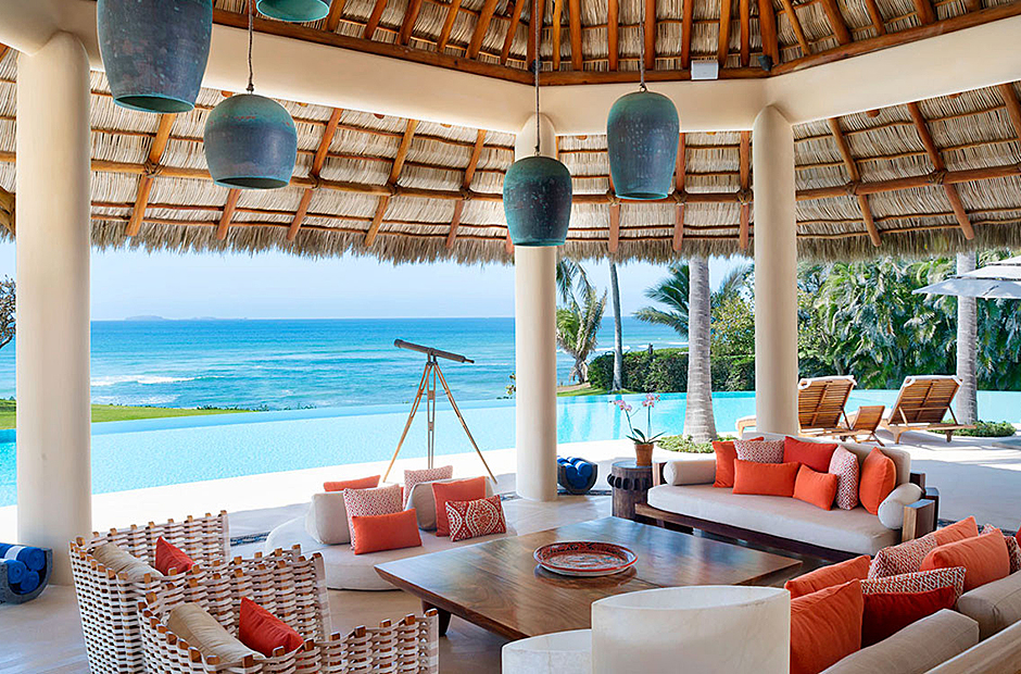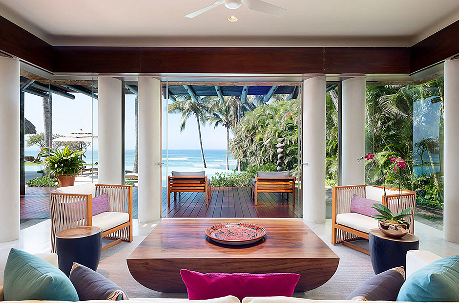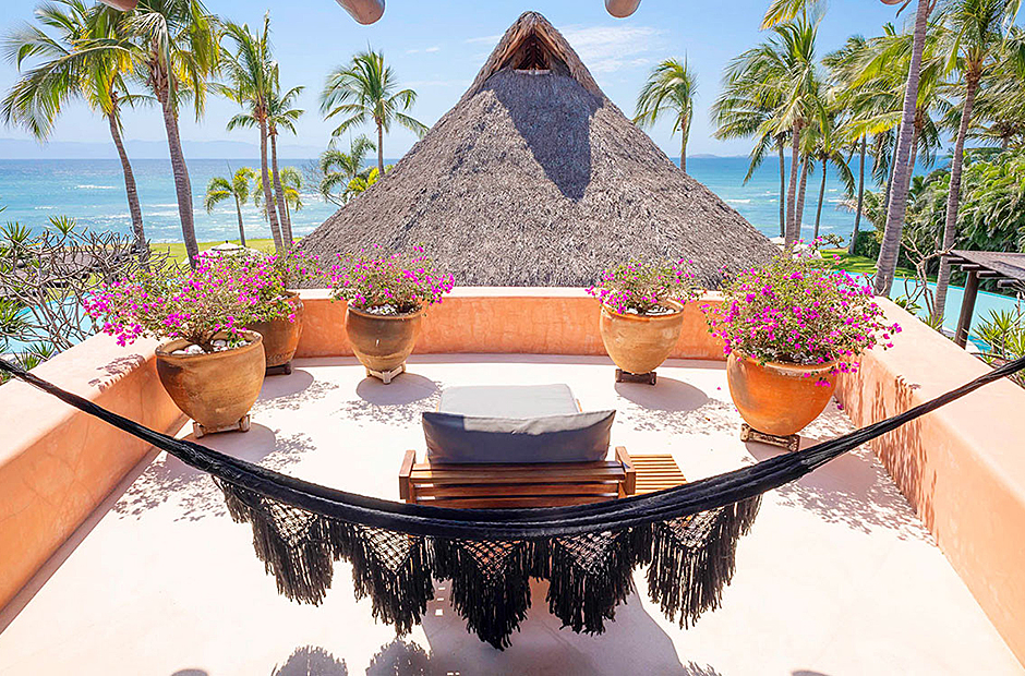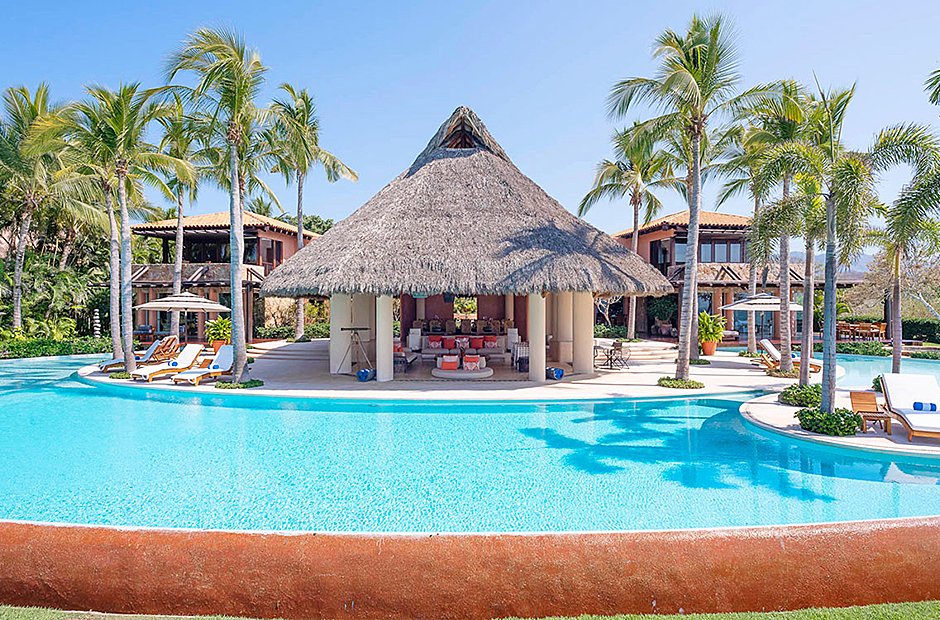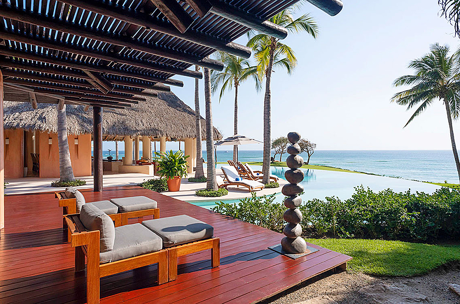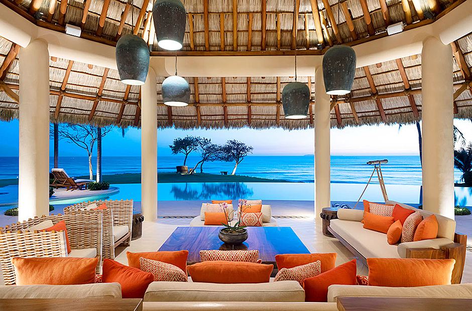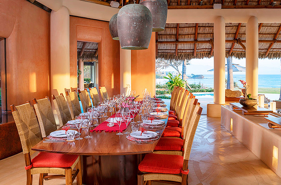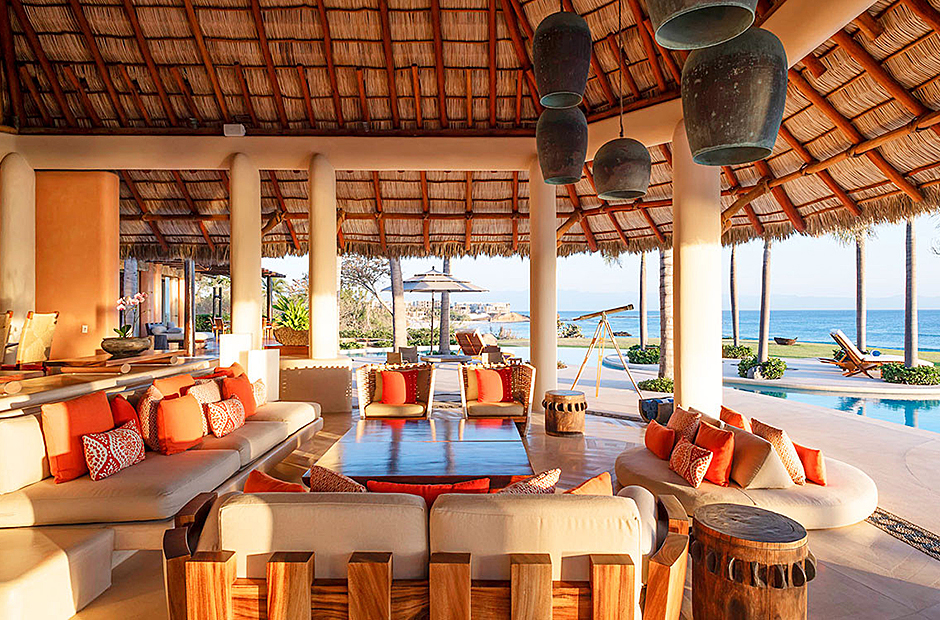 Perched over the white sands of Punta Mita, with direct beach access, this luxury villa features uninterrupted ocean views in all directions and from multiple levels. Outside, the massive thatched-roof shelter hosts oversized sofas, ample dining space, and Mexican arts and crafts. The property’s grand infinity pool flows the entire length of the main house, with 160 feet of infinity edge, surrounded by indigenous trees and tropical gardens.
