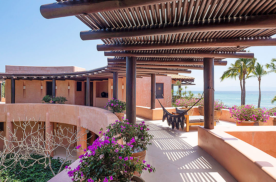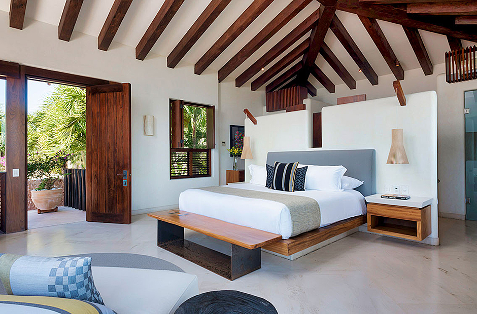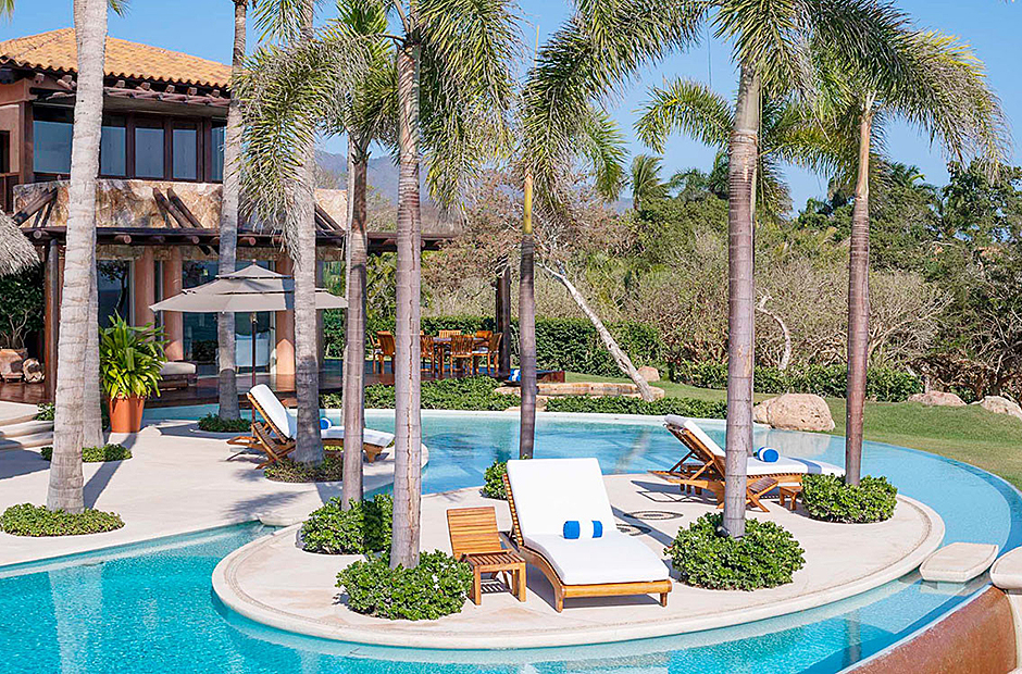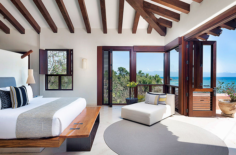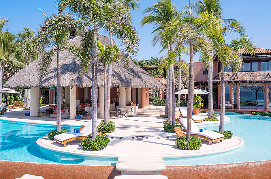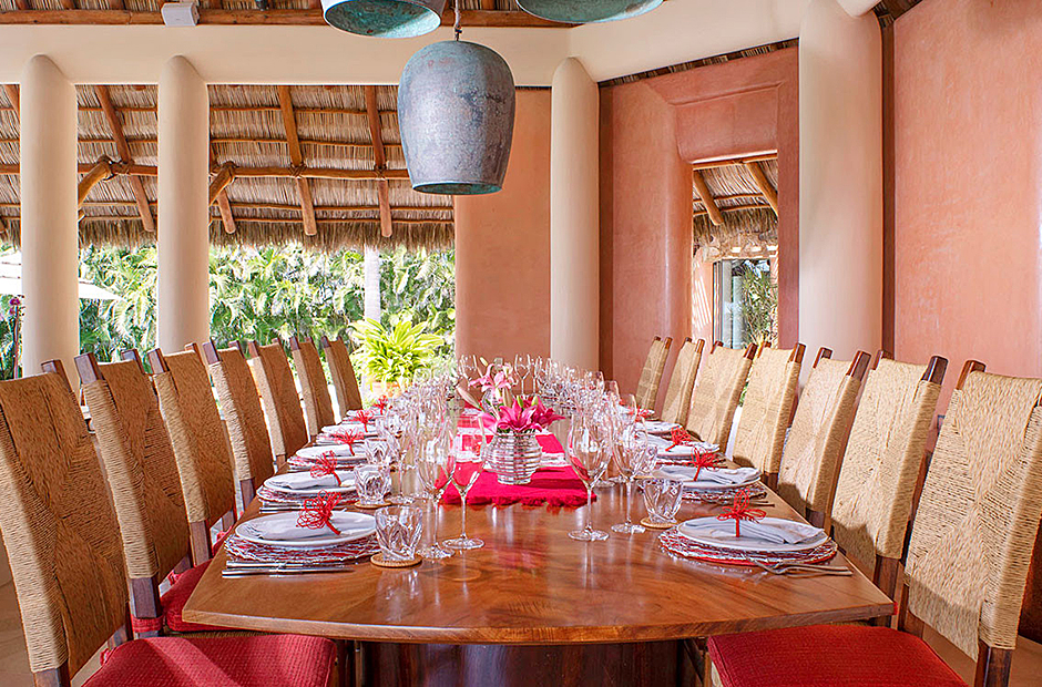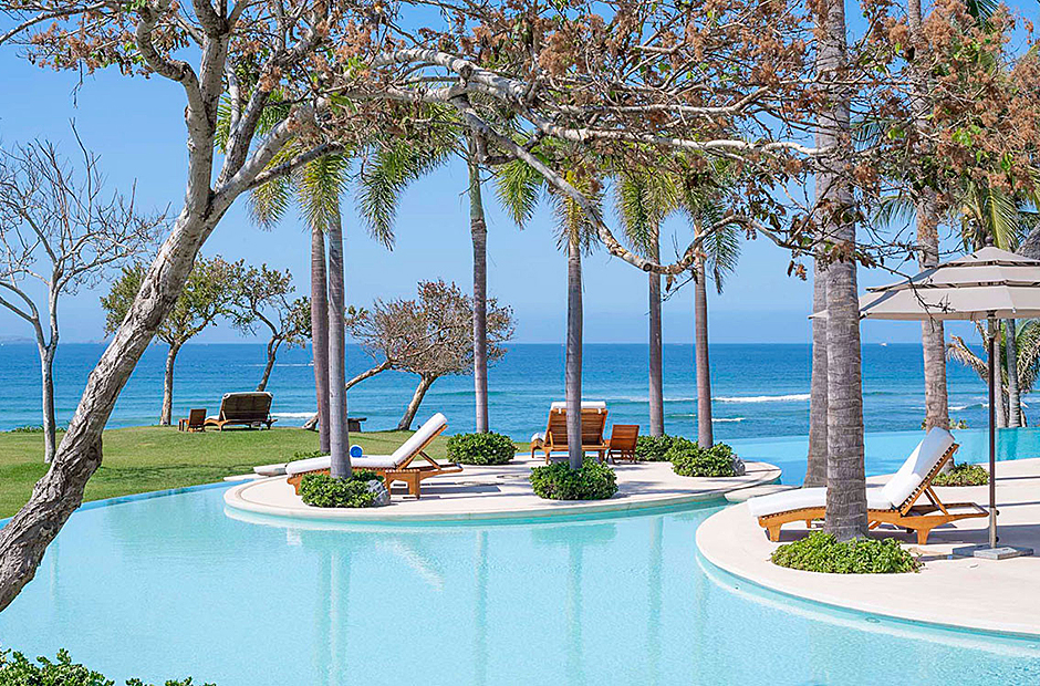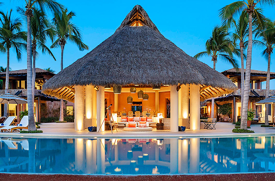 Perched over the white sands of Punta Mita, with direct beach access, this luxury villa features uninterrupted ocean views in all directions and from multiple levels. Outside, the massive thatched-roof shelter hosts oversized sofas, ample dining space, and Mexican arts and crafts. The property’s grand infinity pool flows the entire length of the main house, with 160 feet of infinity edge, surrounded by indigenous trees and tropical gardens.