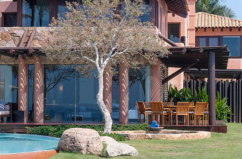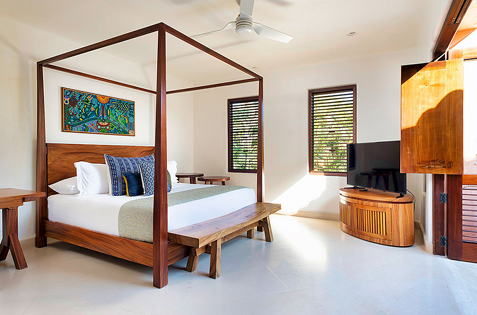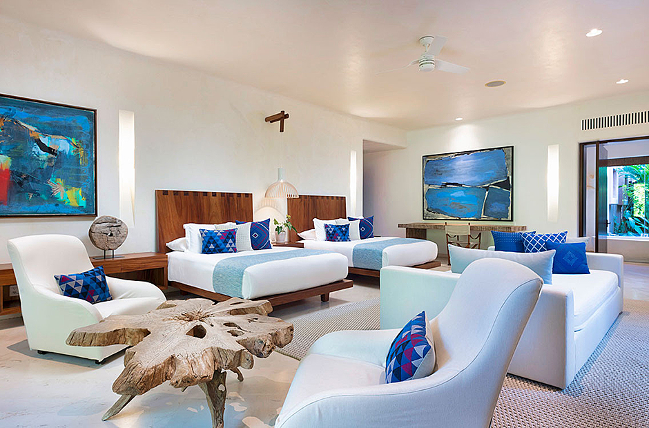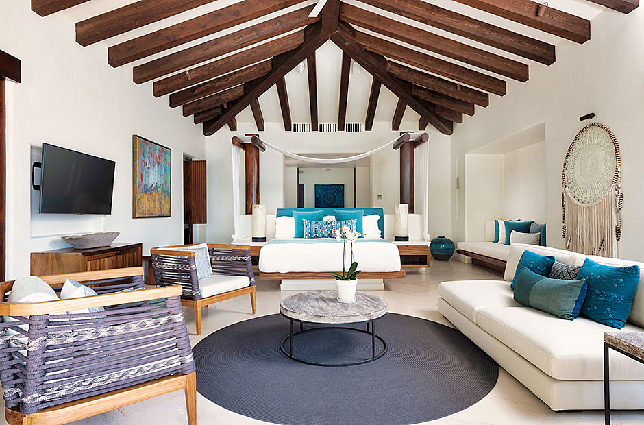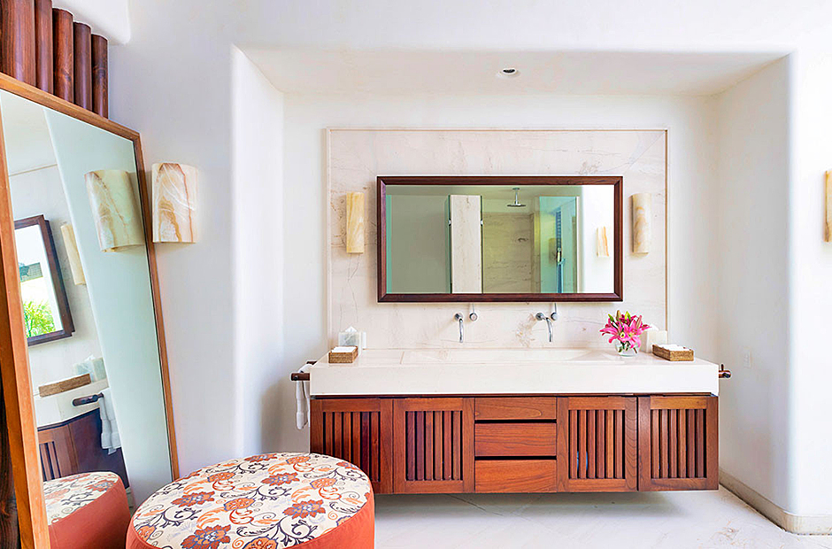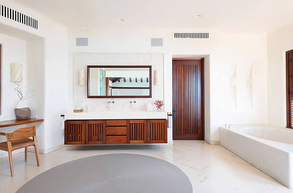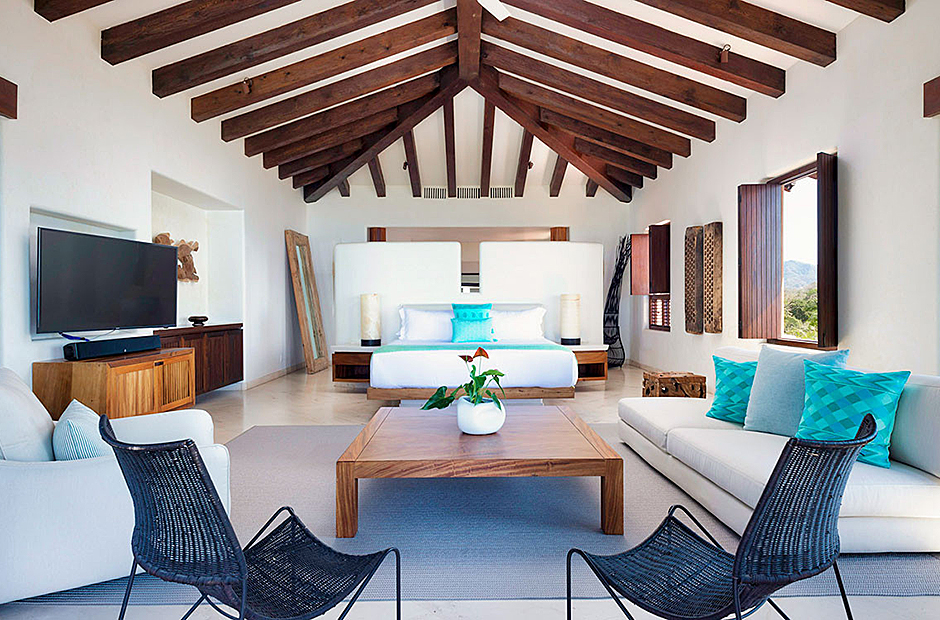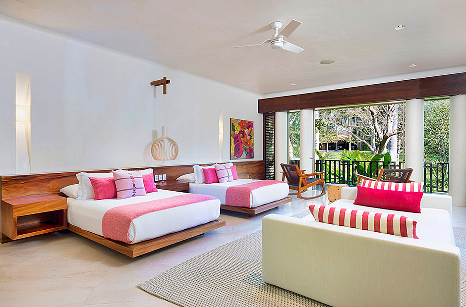 Perched over the white sands of Punta Mita, with direct beach access, this luxury villa features uninterrupted ocean views in all directions and from multiple levels. Outside, the massive thatched-roof shelter hosts oversized sofas, ample dining space, and Mexican arts and crafts. The property’s grand infinity pool flows the entire length of the main house, with 160 feet of infinity edge, surrounded by indigenous trees and tropical gardens.