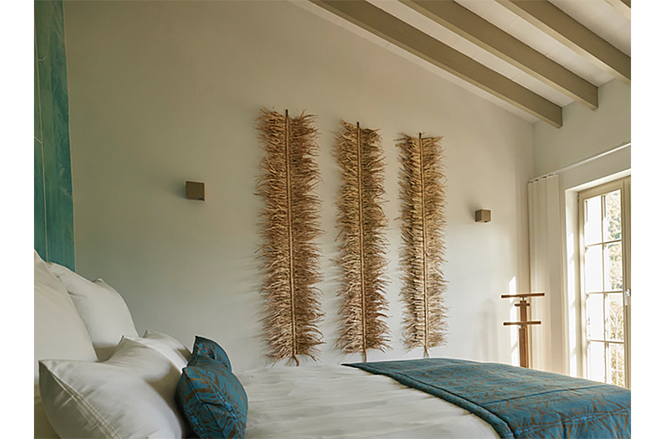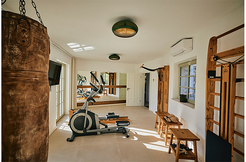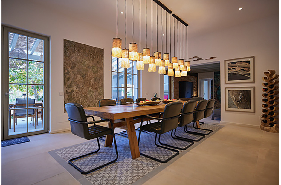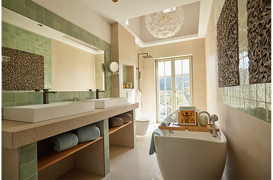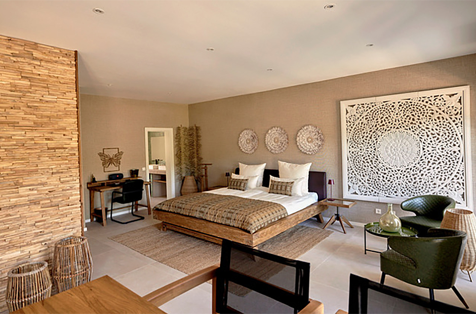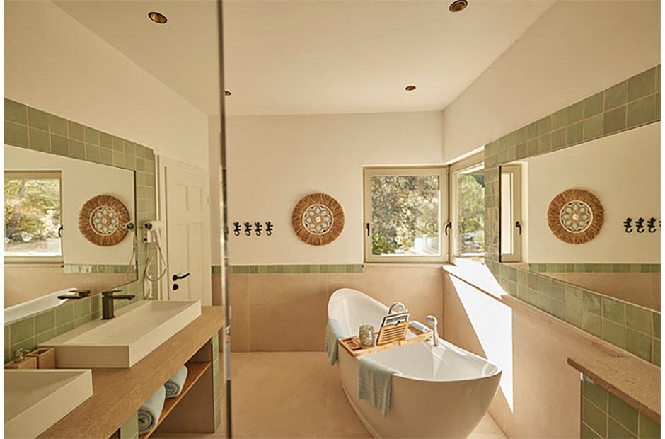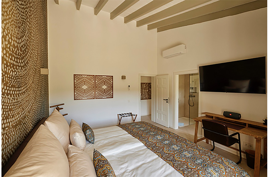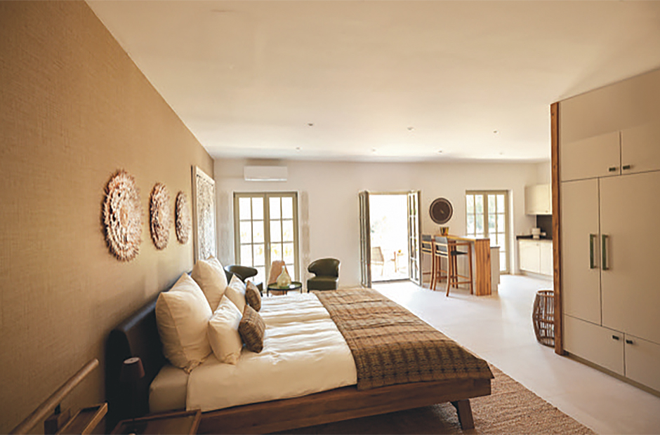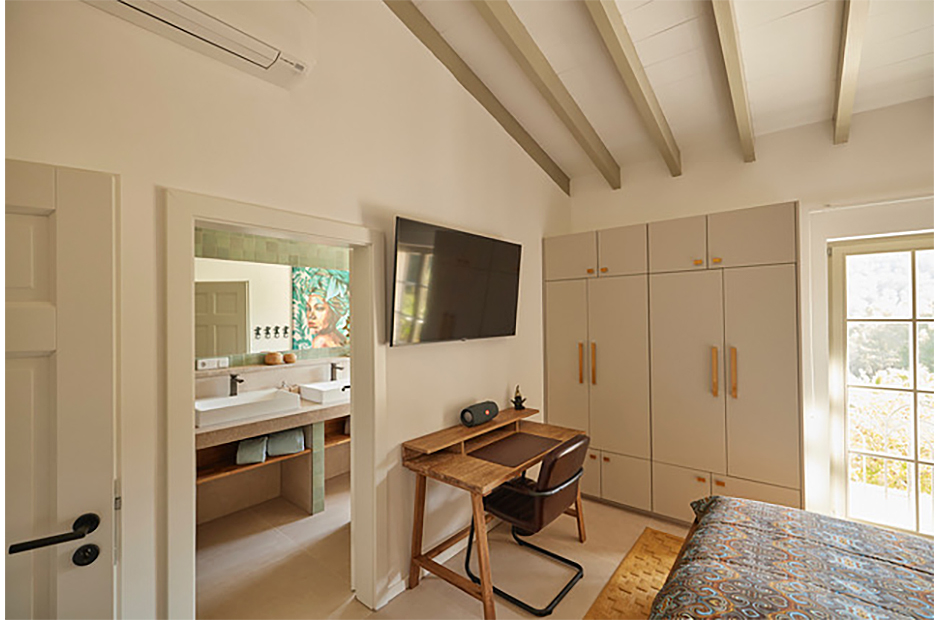 This villa accommodates up to 10 guests across five uniquely styled bedrooms. On the upper floor of the main house, four bedrooms each feature an ensuite bathroom, with two of these bathrooms also offering bathtubs. A separate guest studio includes a bathroom, separate toilet, kitchenette, and kitchen bar with stools. Each bedroom is fitted with extra-long beds, air conditioning, and elegant décor, ensuring a comfortable and restful stay.