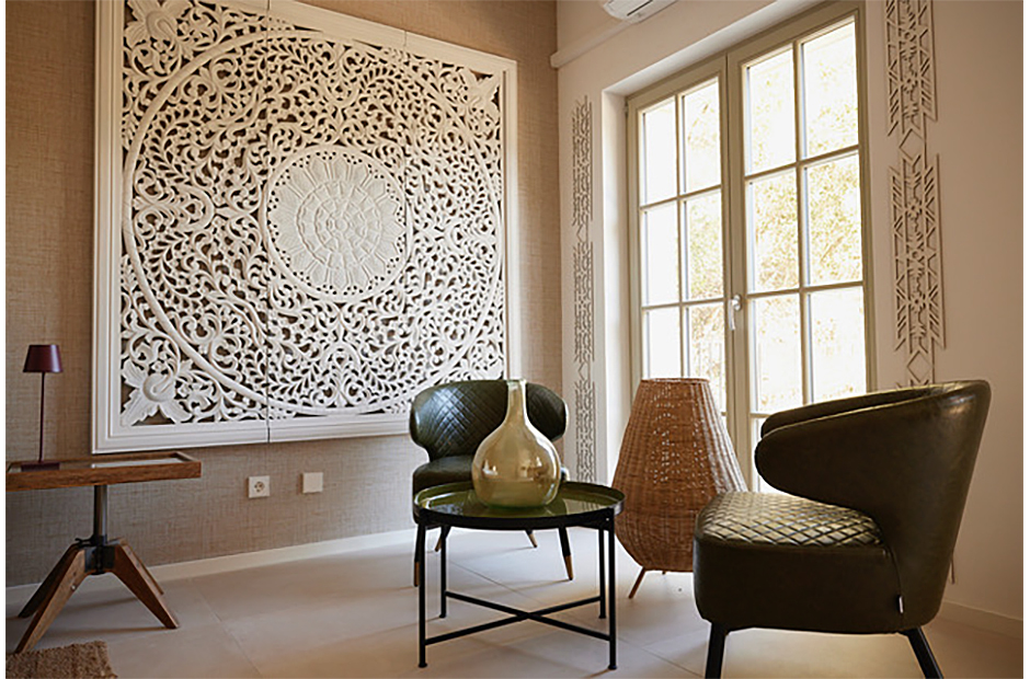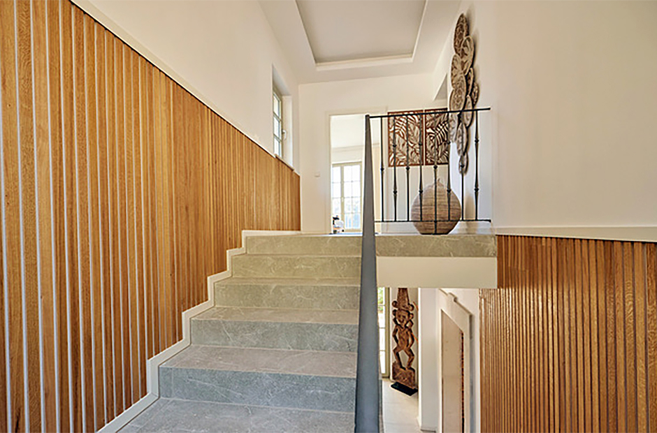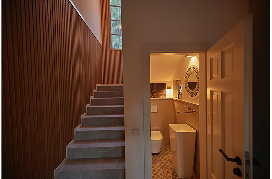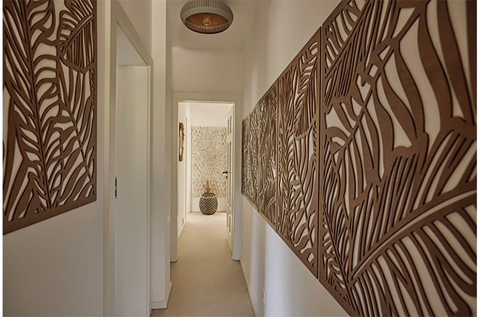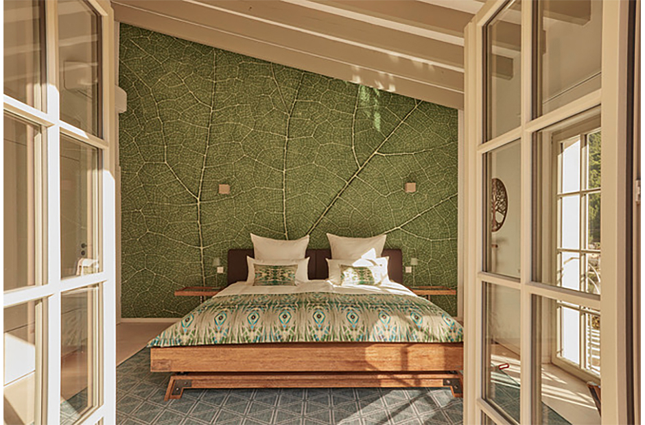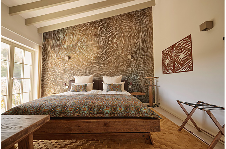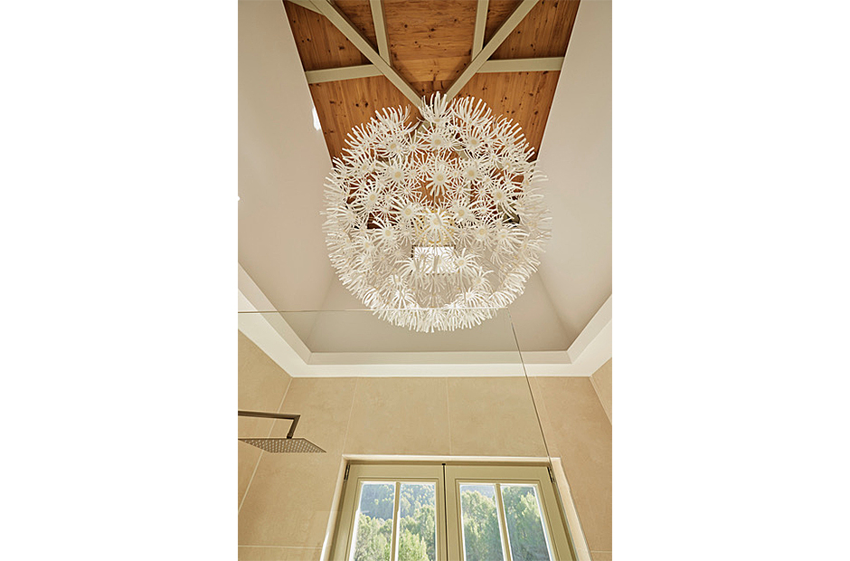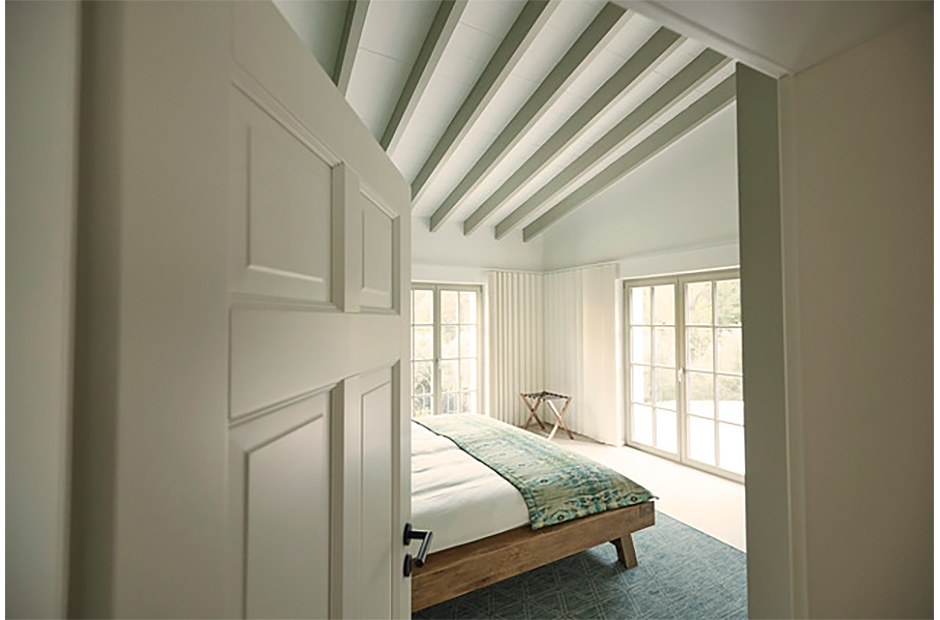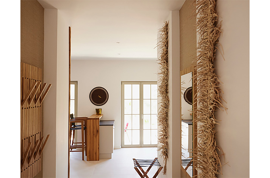 This villa accommodates up to 10 guests across five uniquely styled bedrooms. On the upper floor of the main house, four bedrooms each feature an ensuite bathroom, with two of these bathrooms also offering bathtubs. A separate guest studio includes a bathroom, separate toilet, kitchenette, and kitchen bar with stools. Each bedroom is fitted with extra-long beds, air conditioning, and elegant décor, ensuring a comfortable and restful stay.
