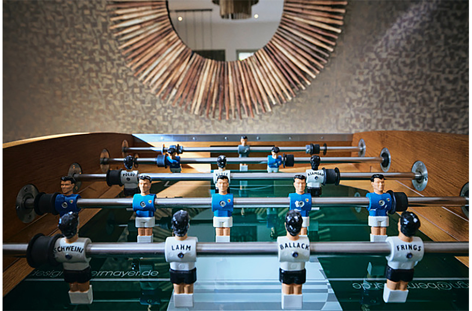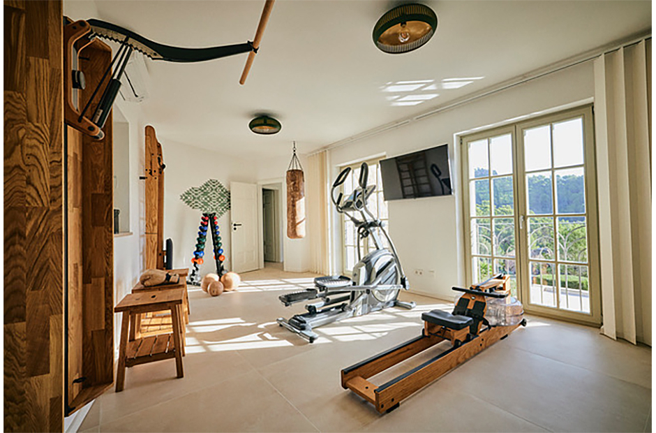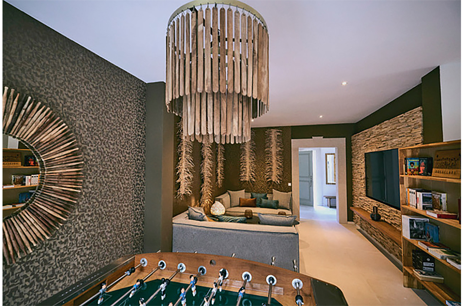 This villa offers multiple areas for relaxation and recreation. The tastefully designed living spaces include a TV lounge with table football, comfortable sofas, and a dining area, providing various entertainment options. The fitness room and sauna offer opportunities for exercise and relaxation, while the expansive outdoor terraces and large swimming pool create a magical environment for unwinding. With views of surrounding palm trees and pines, guests can enjoy personal retreat and memorable gatherings under the southern sky.