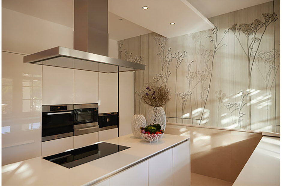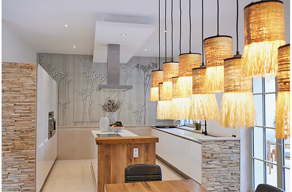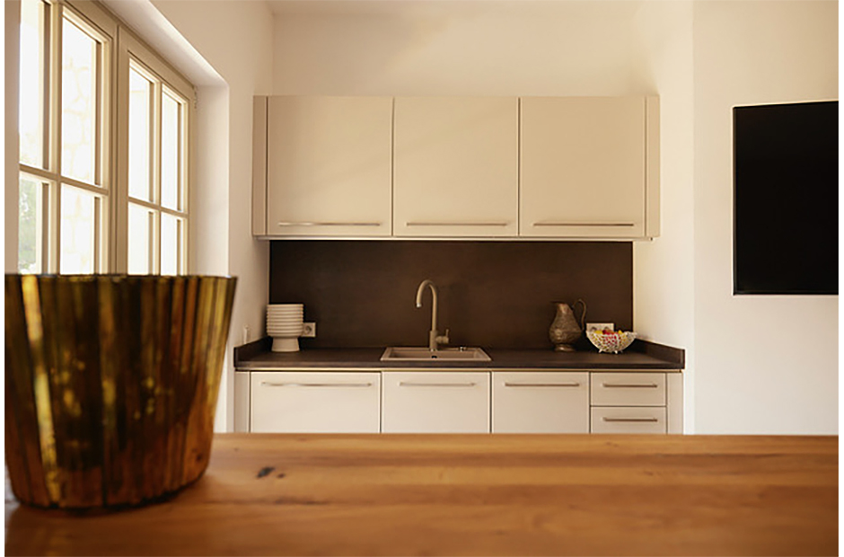 The modern, open-plan kitchen is outfitted with high-quality appliances. Outdoors, the terrace features an alfresco dining area with a long table for up to 12 guests, an outdoor kitchen, and a grill, making it ideal for enjoying meals in the fresh air.