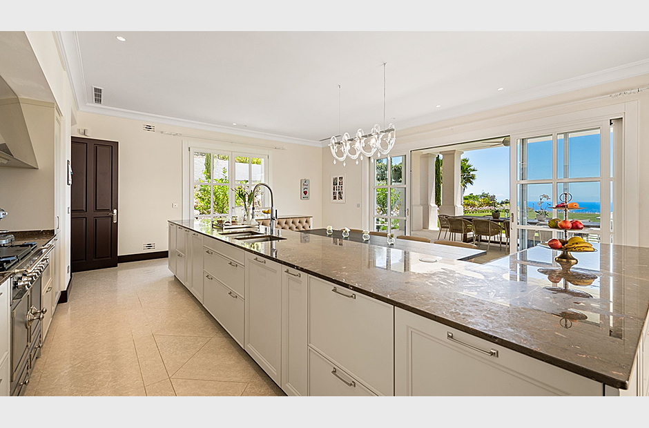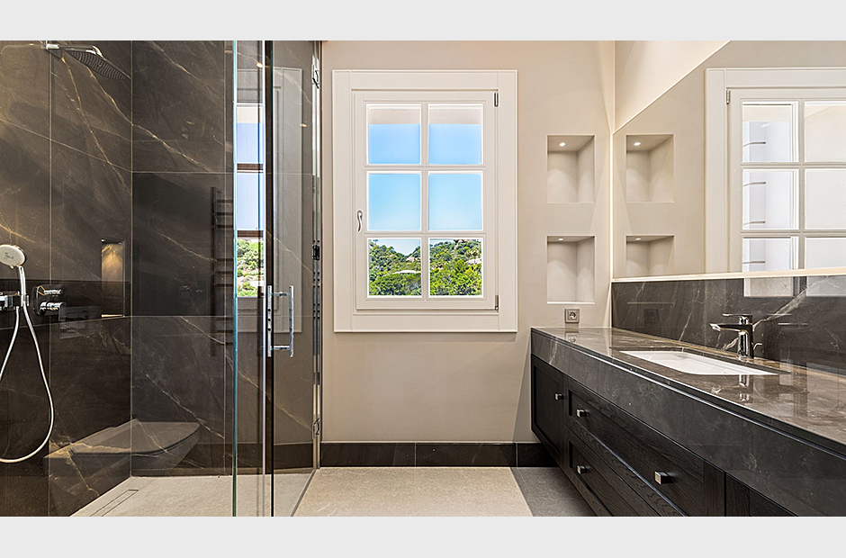 Through a driveway, we access the main entrance with parking area. The accommodation of this spectacular mansion with open sea views comprises on the ground floor a guest toilet, fully fitted and equipped kitchen with breakfast area and adjacent formal dining room and lounge with views to the entrance courtyard. Just behind the main kitchen there is a secondary kitchen with stairs down to the lower level with laundry room and independent entrance for staff. In the western wing of the ground floor there is a living room with a fireplace and exit to the covered porch overlooking the pool and garden. There is also a guest bedroom suite with dressing area, bathroom and an office with a fireplace and private bathroom. The latter could easily be used as an additional bedroom suite.