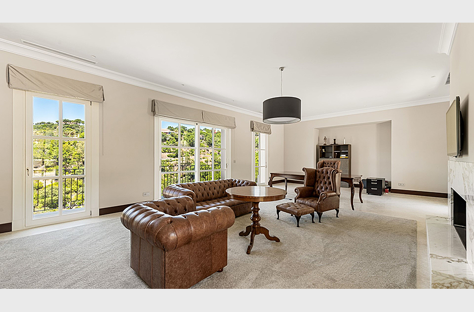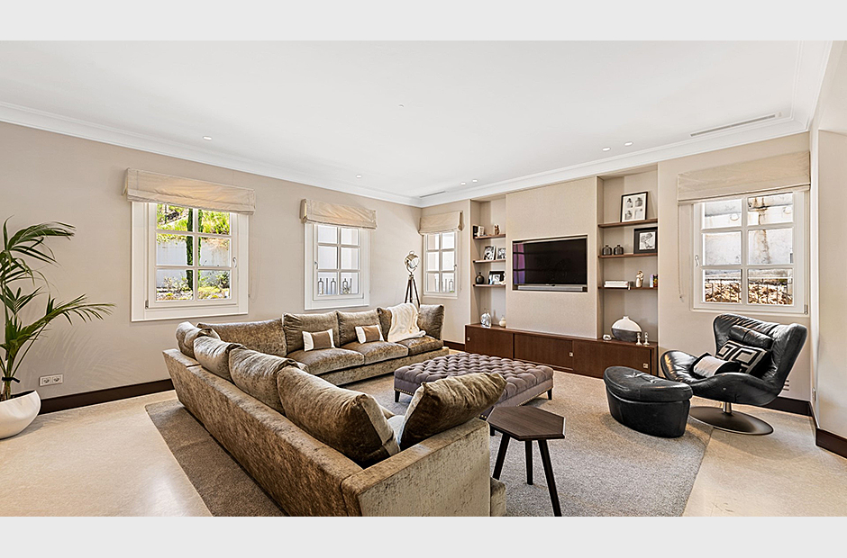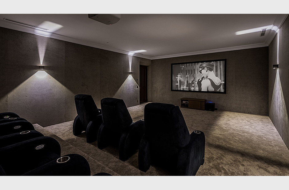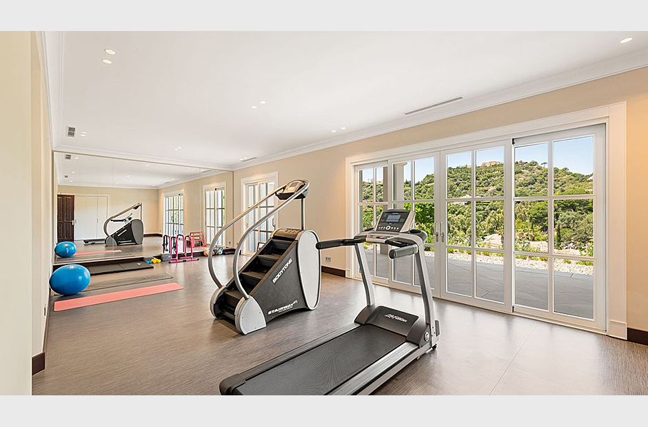 The lower floor is distributed into a gymnasium with windows, a cinema room, and an apartment which could be used by staff or guests. Underneath the car port there is a separate staff apartment with kitchenette and bedroom.