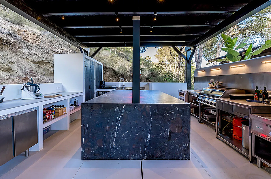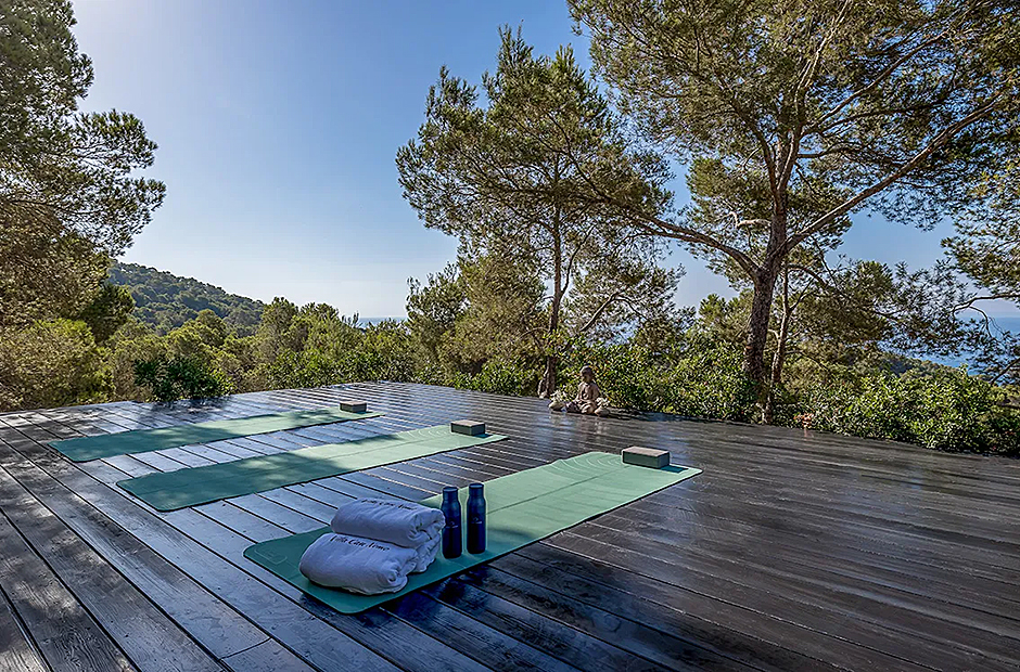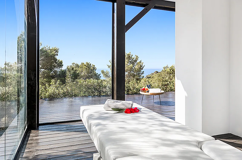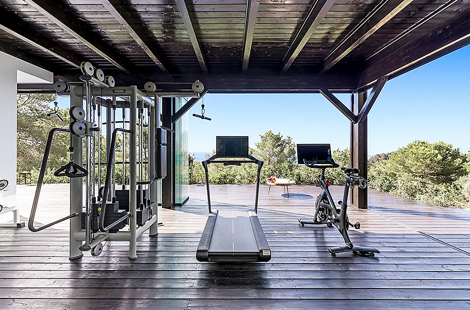 Its multiple sun terraces allow guests to enjoy the scenery from a variety of perspectives. Dive deep into the villa's sparkling blue pool and bask in the Ibizan sun on its surrounding lounge areas. Enjoy daily al-fresco meals at your outdoor dining area complete with pizza oven. Workout in style with the villa’s very own Peloton machines and sun deck dedicated to yoga and pilates.