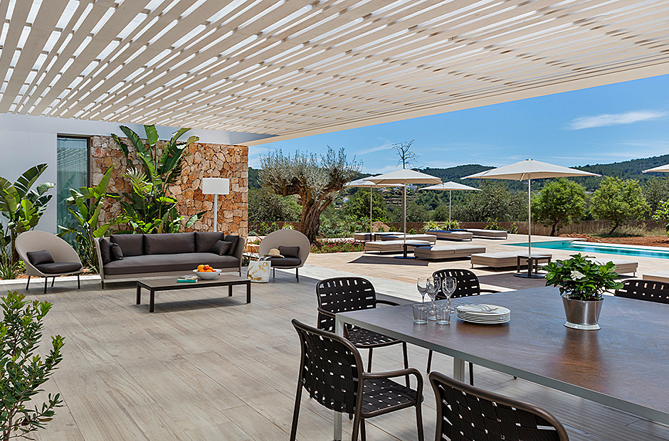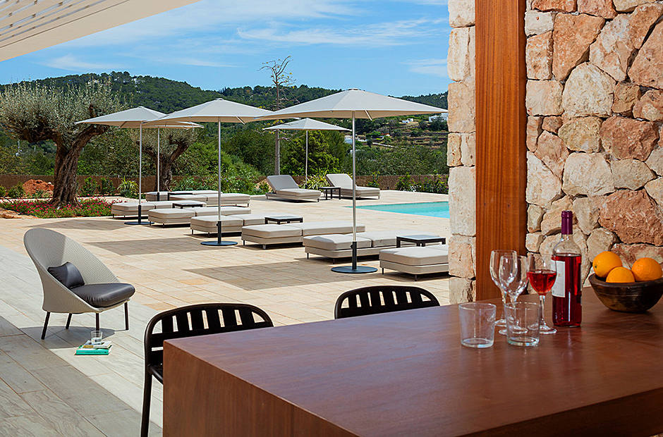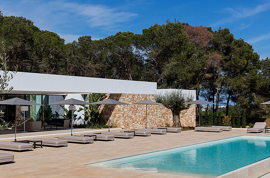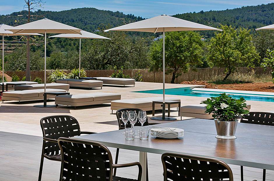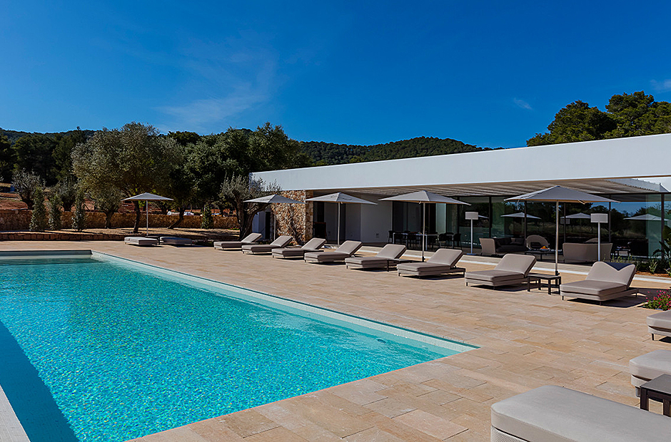 This luxury villa is a unique enclave surrounded by nature, providing a perfect blend of calm, natural light, and a serene environment. The outdoor spaces are designed for relaxation and entertainment, featuring a spacious dining area, barbecue, and hammocks for up to 14 people—all centered around a modern infinity pool with a salt electrolysis system. The villa's outdoor area offers panoramic views of the picturesque countryside and Santa Eulalia's mountains.