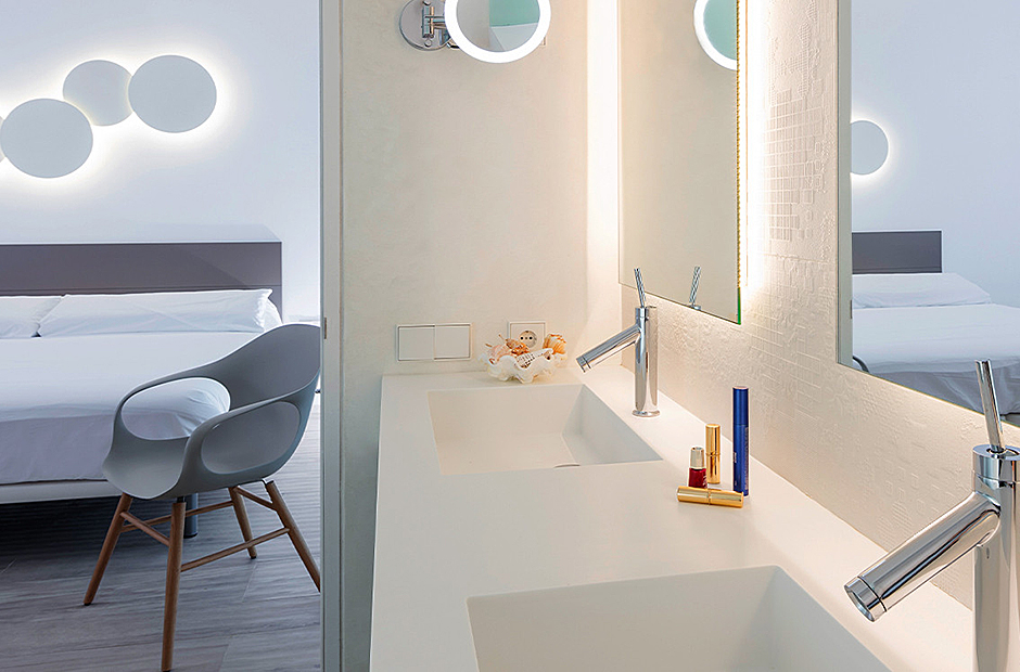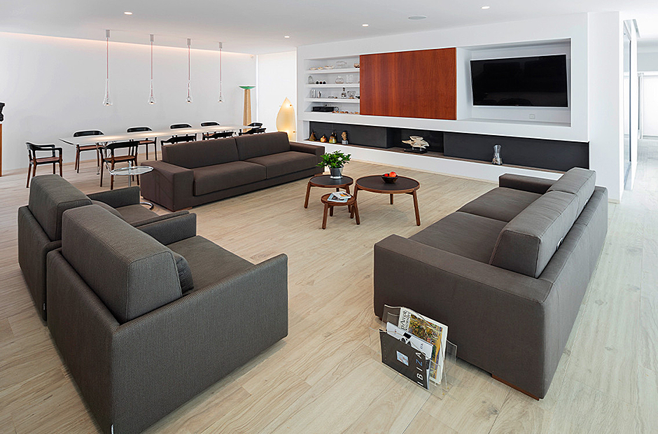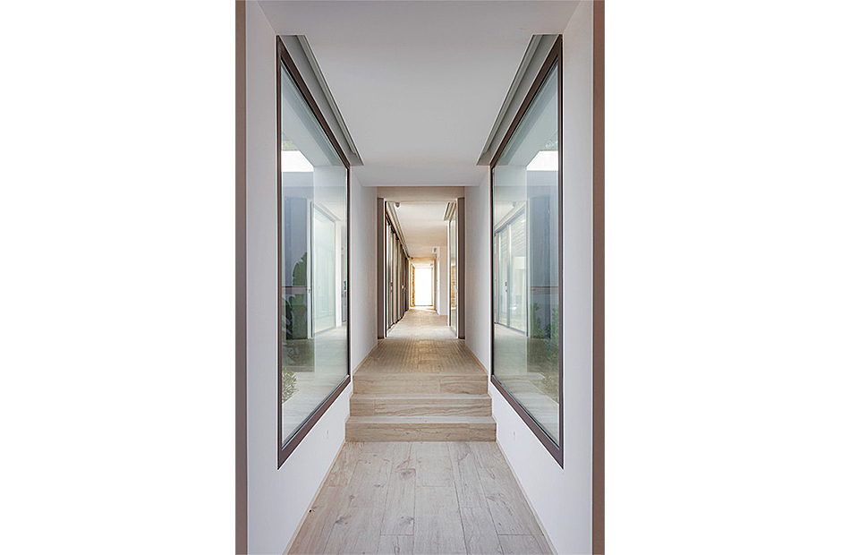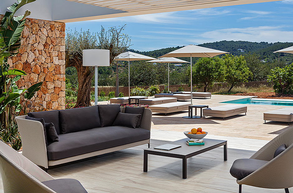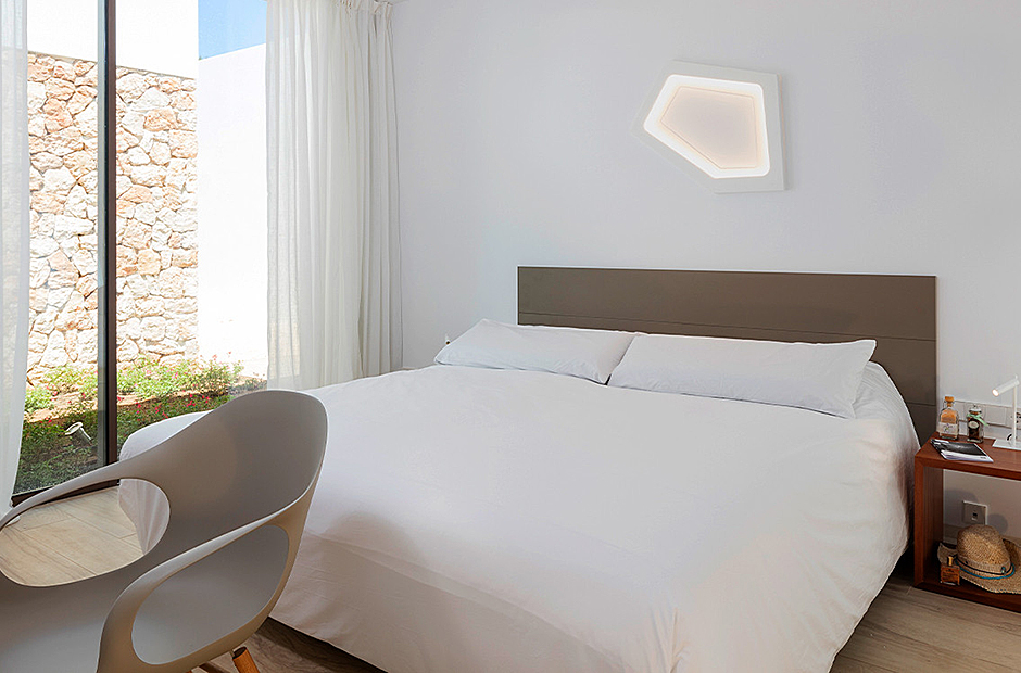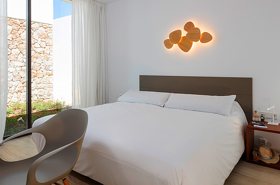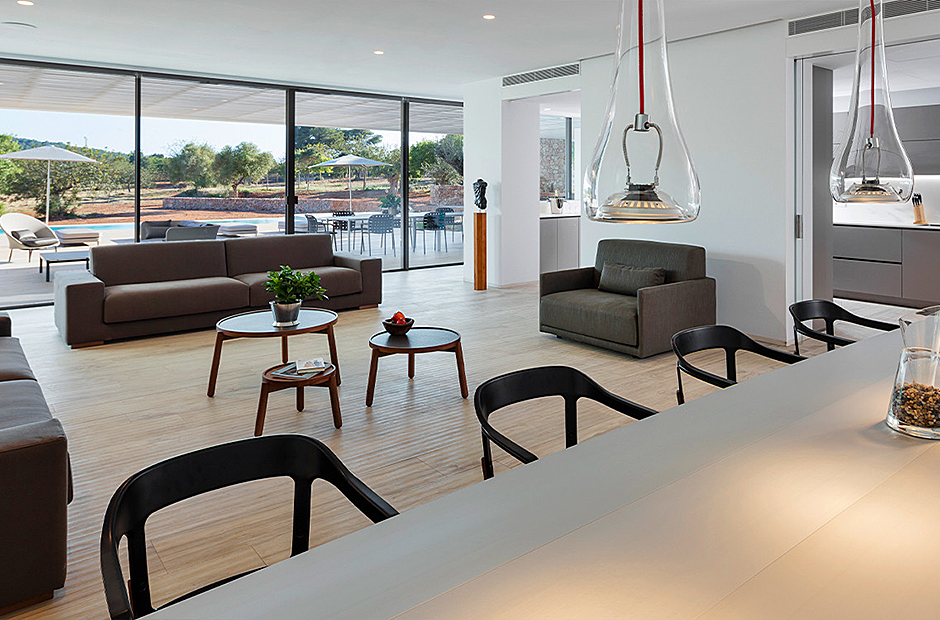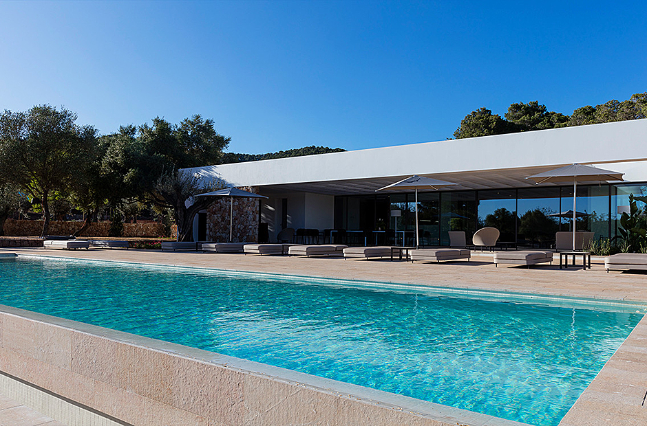 This villa's interior spaces are thoughtfully designed to welcome the light of Ibiza into every corner. The villa is arranged on a single level, featuring seven suites, each with its own living room and ensuite bathroom, along with a safe in each suite. The dining room and living room open up to the outdoor pool area, creating a seamless connection between indoor and outdoor living.