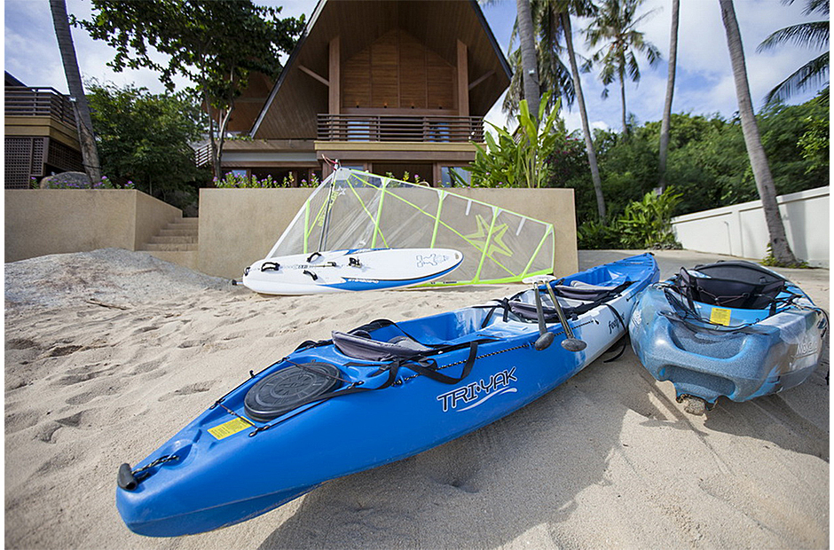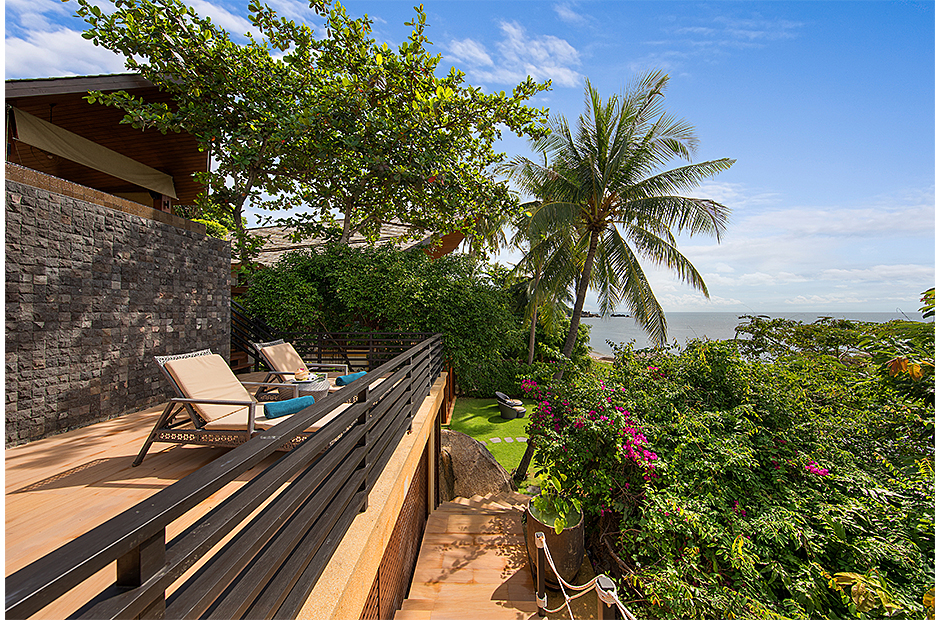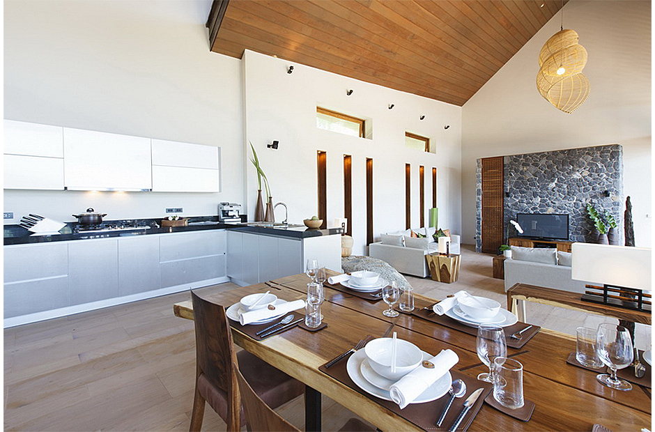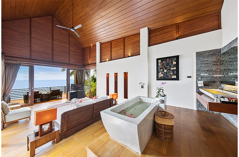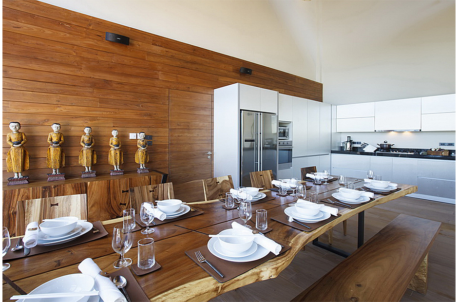 We love the high-ceilinged living complete with oversized sofas and fully-equipped entertainment system, which opens out onto breathtaking views and an infinity-edge pool. The open-plan dining space and kitchen is a beauty to behold, thanks to its full range of modern appliances, as well as a huge wooden dining table that seats up to 10 people, whilst the adjacent poolside sala is perfect for al fresco feasting and relaxation.