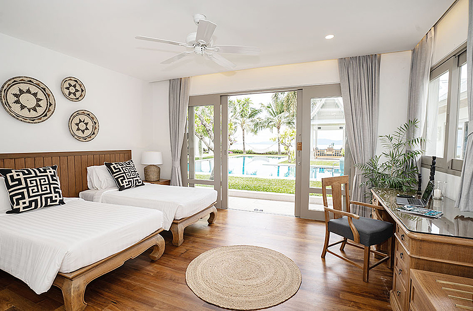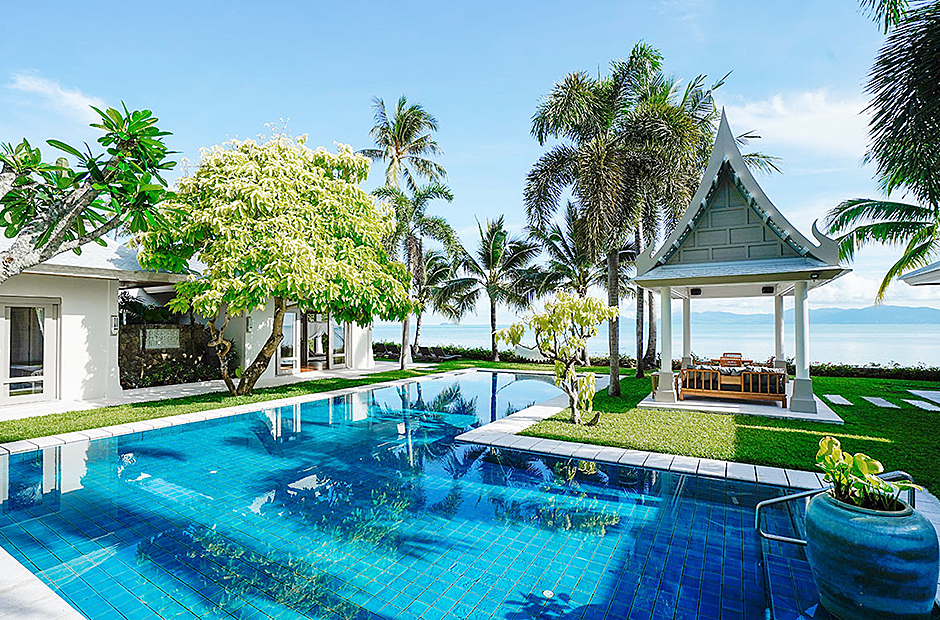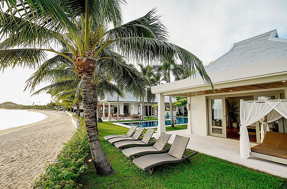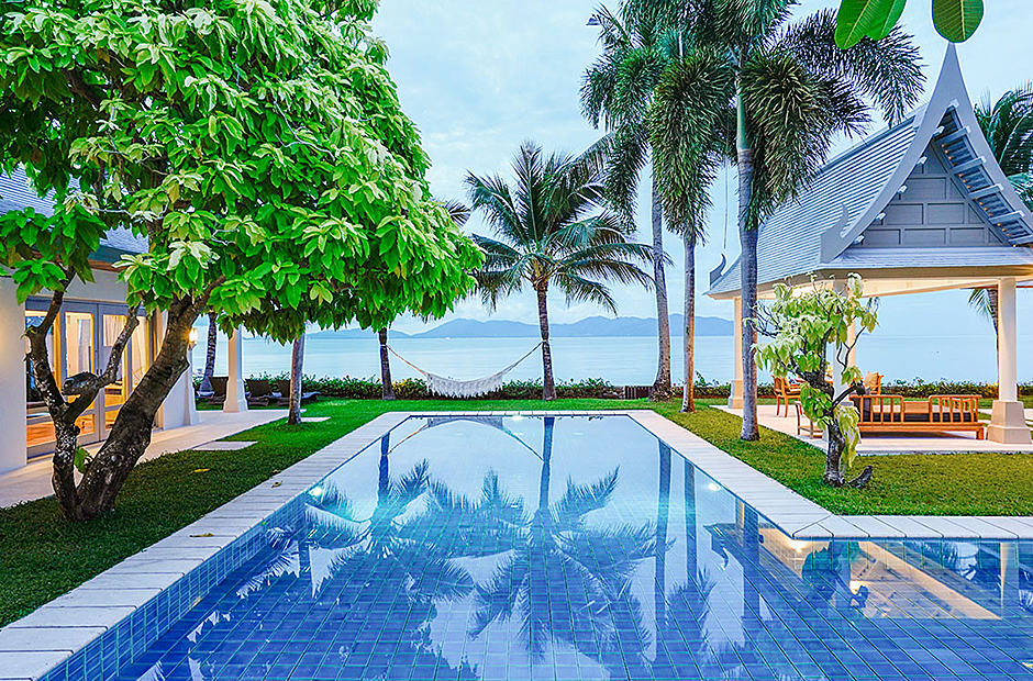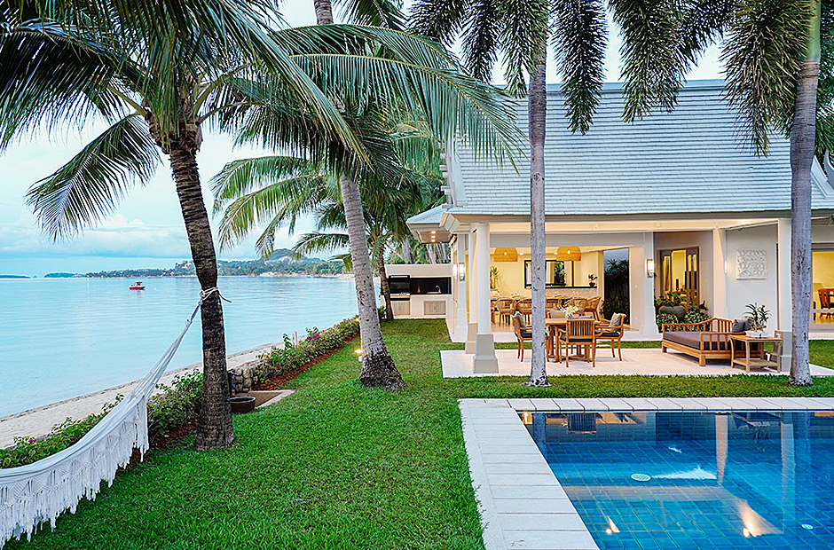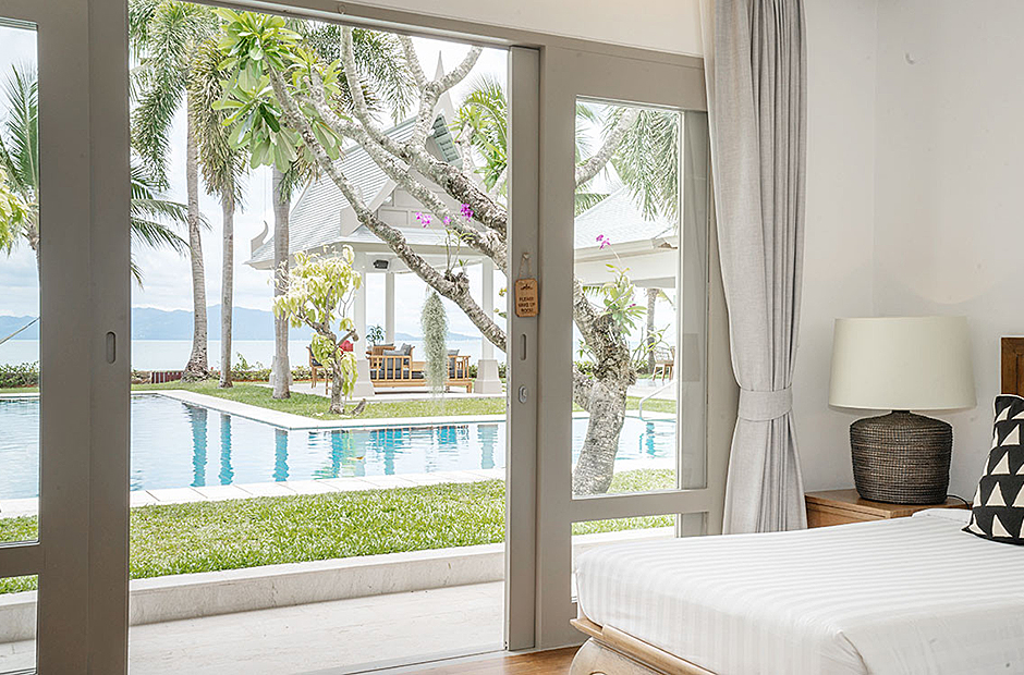 This stunning five-bedroom villa will transport you to Bali with its contemporary whitewashed interior, wood carvings and rattan furnishings. To make the most of the impressive 36 metres of beach frontage, each room is situated around the pool, while the spacious grounds feature tropical gardens, a shaded Thai sala and a large living area.
