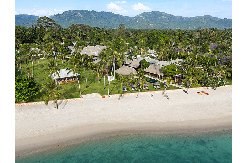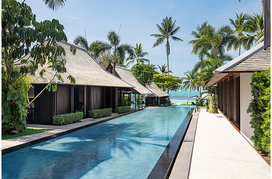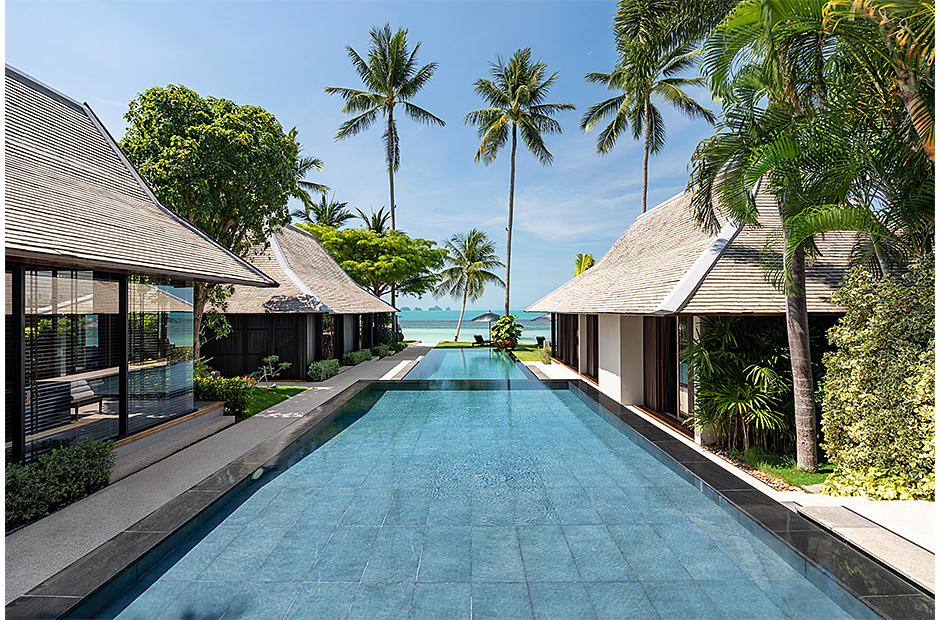 Along Koh Samui’s scenic western coast lies this beautiful beachfront villa. With 6 en-suite bedrooms, 3 tiered swimming pools, a fitness center, spa, a basketball court, and a tennis court; interior opulence meets a bright tropical landscape in this elegant abode.