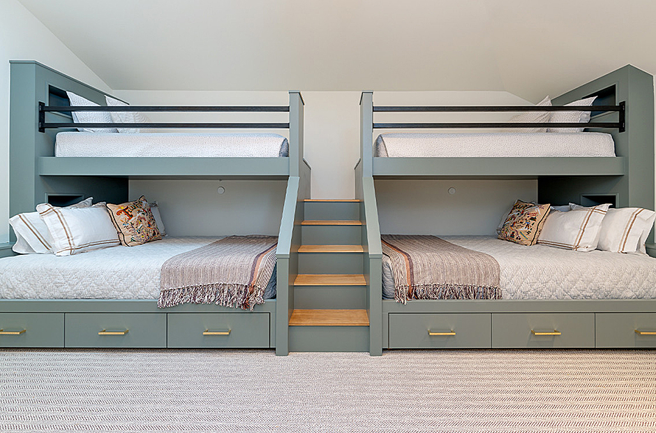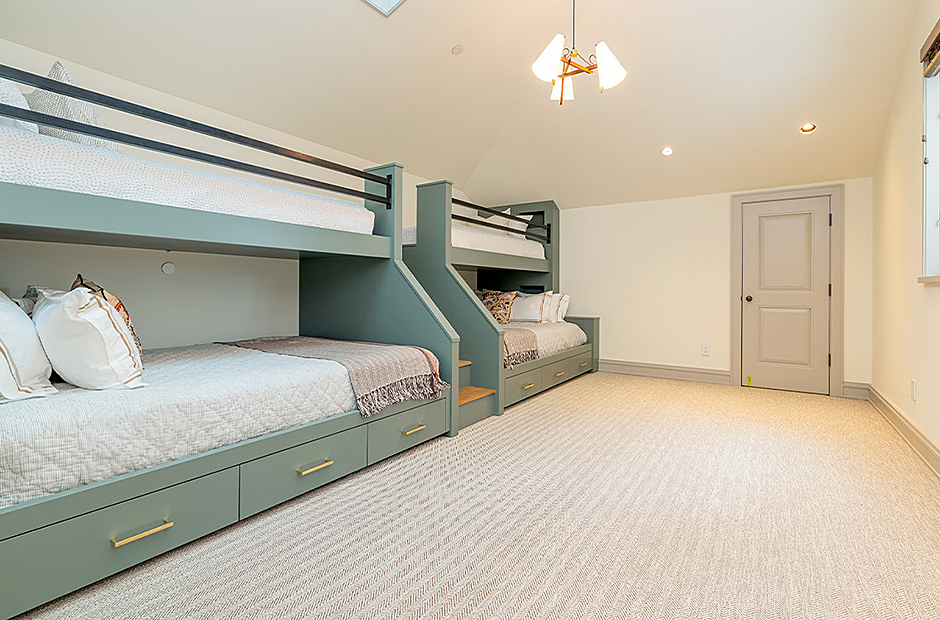 Upstairs, three of the four bedrooms are appointed with modern ensuite bathrooms—one featuring a cedar soaking tub and shower, the other with a porcelain soaking tub and shower. The spacious bunk room comfortably accommodates six children. On the lower level, the theater room is equipped with a wrap-around couch, a large screen TV, and soundproof curtains. This floor also includes a cozy king bedroom with an ensuite.