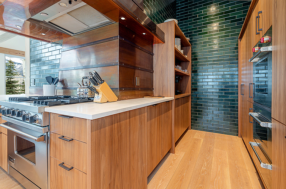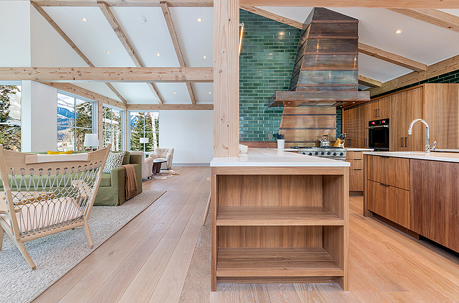 The main living area boasts an open floor plan with expansive windows framing stunning views of the rugged mountains. The kitchen, featuring rich emerald tones and warm wood accents, harmonizes beautifully with the contemporary architecture. The living room offers two distinct seating areas and a double-sided stone fireplace that provides warmth to both the interior and the patio.