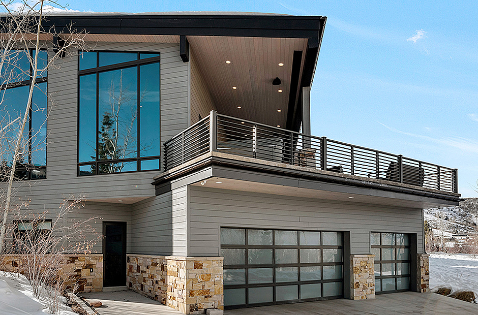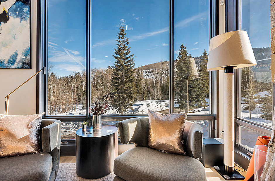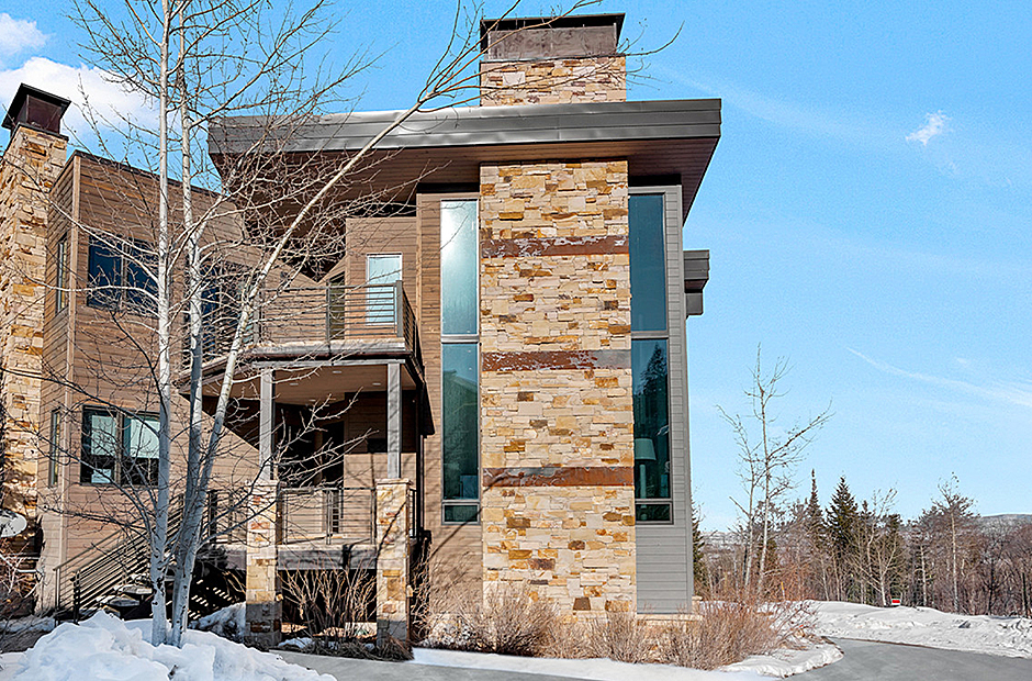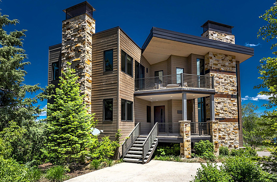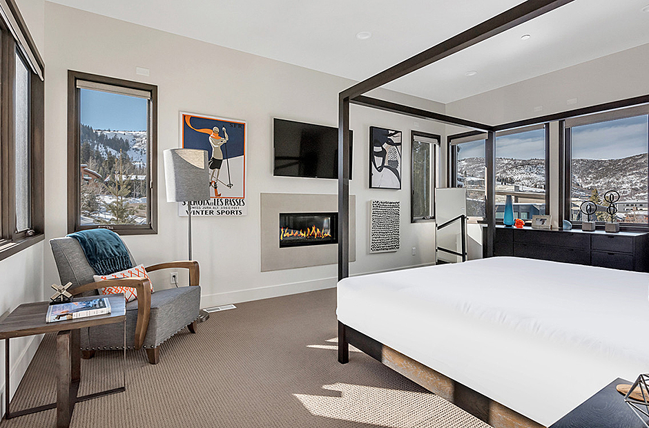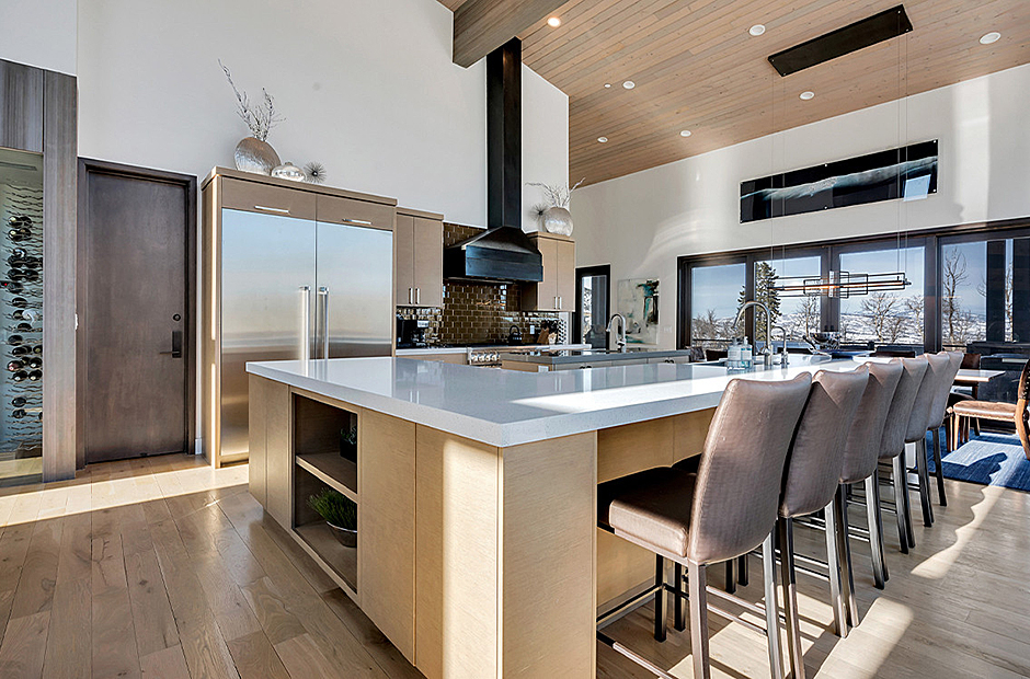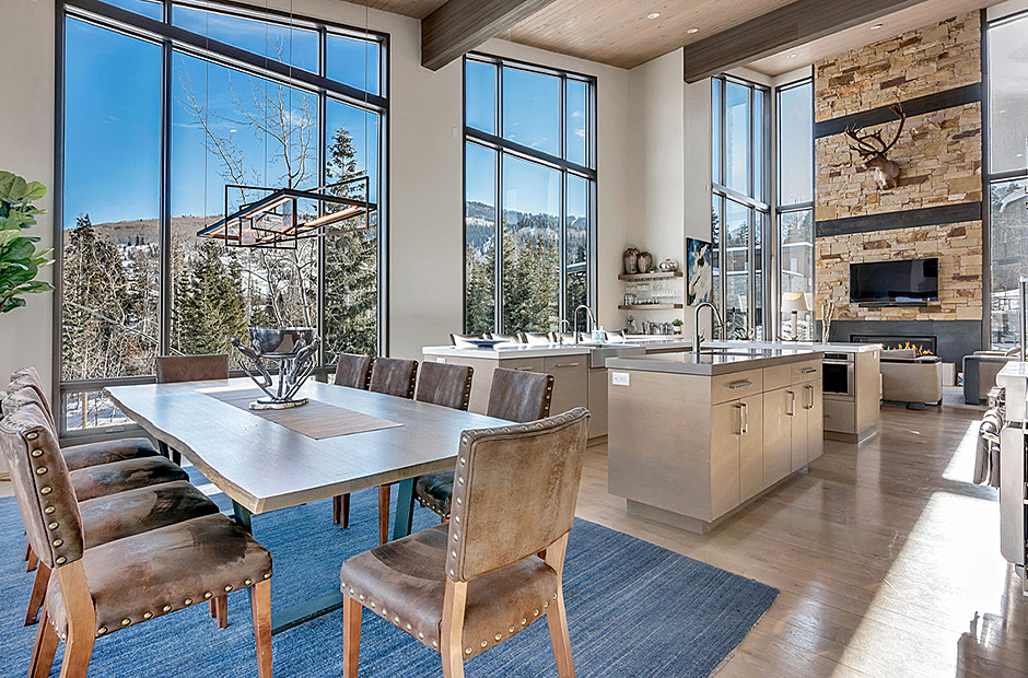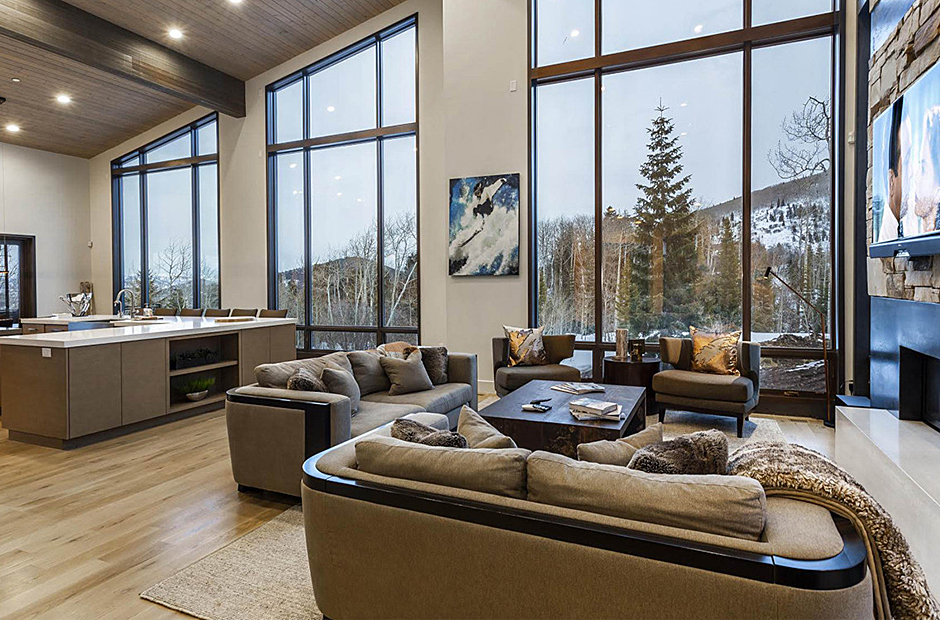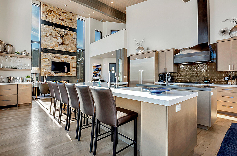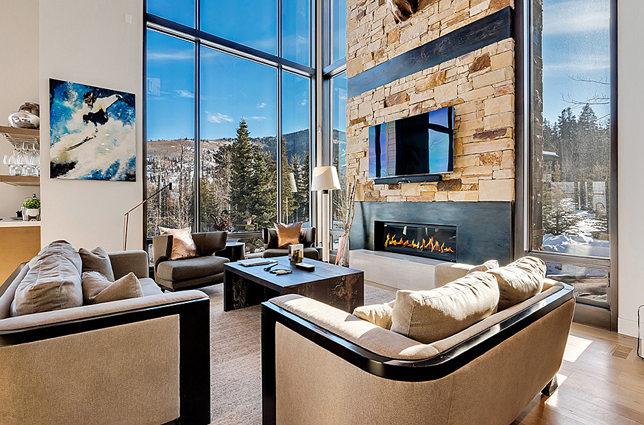 Modern, geometric design produces spacious quarters and living areas. With walls of custom glass surrounding the entire mid-level, the views and atmosphere won't disappoint. The main living area has high ceilings, a stone wall fireplace, an oversized kitchen and floating island equipped with Thermador appliances, boasting modern spacious living.