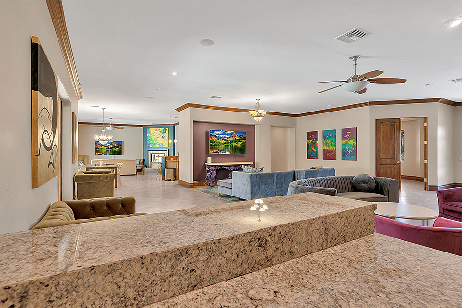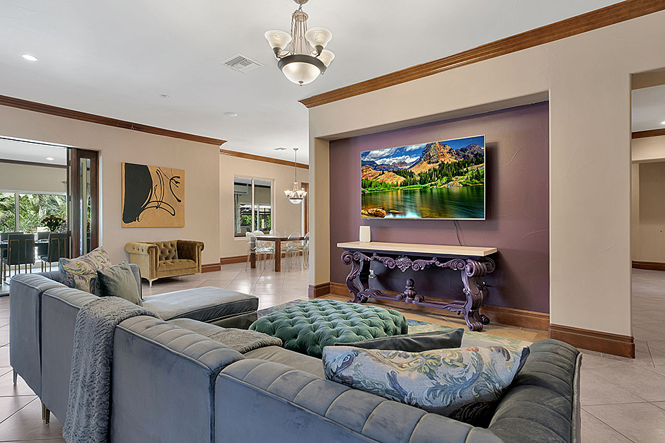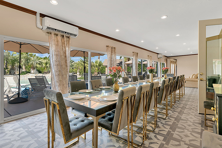 The 11 bedrooms easily accommodate larger groups, and 8 full bathrooms ensure comfortability. The open-concept living room areas feature tons of living room seating options, a breakfast table for 8, and 6 bar stool seats. Huge living room/kitchen areas with lots of seating. The additional indoor/outdoor dining area great for groups. Leave the many sliding glass doors closed for indoor dining, or open them for covered dining open to the outside, adjacent to the gorgeous over-sized pool. A home that accommodates as comfortably as this one is nearly impossible to find.
